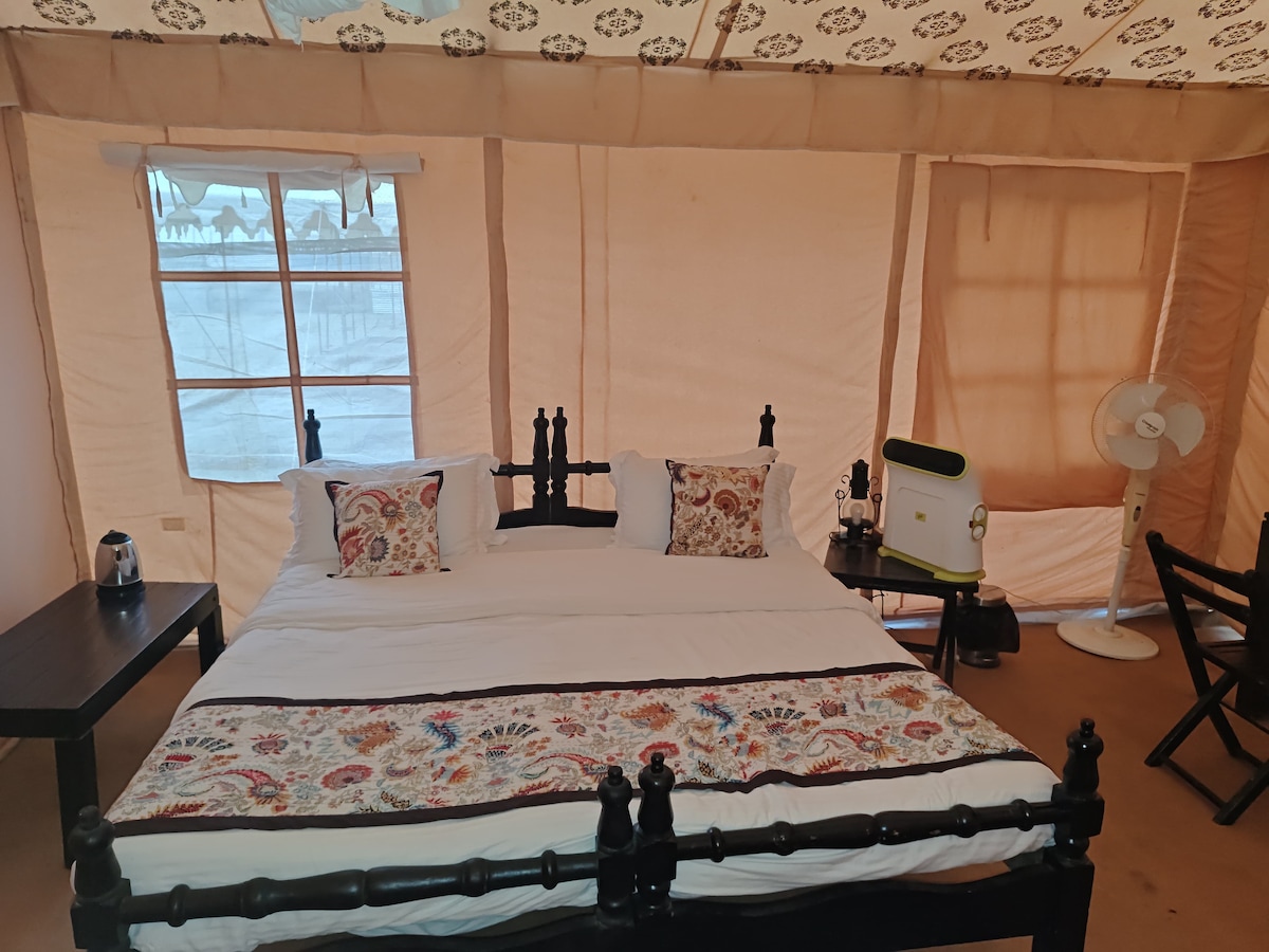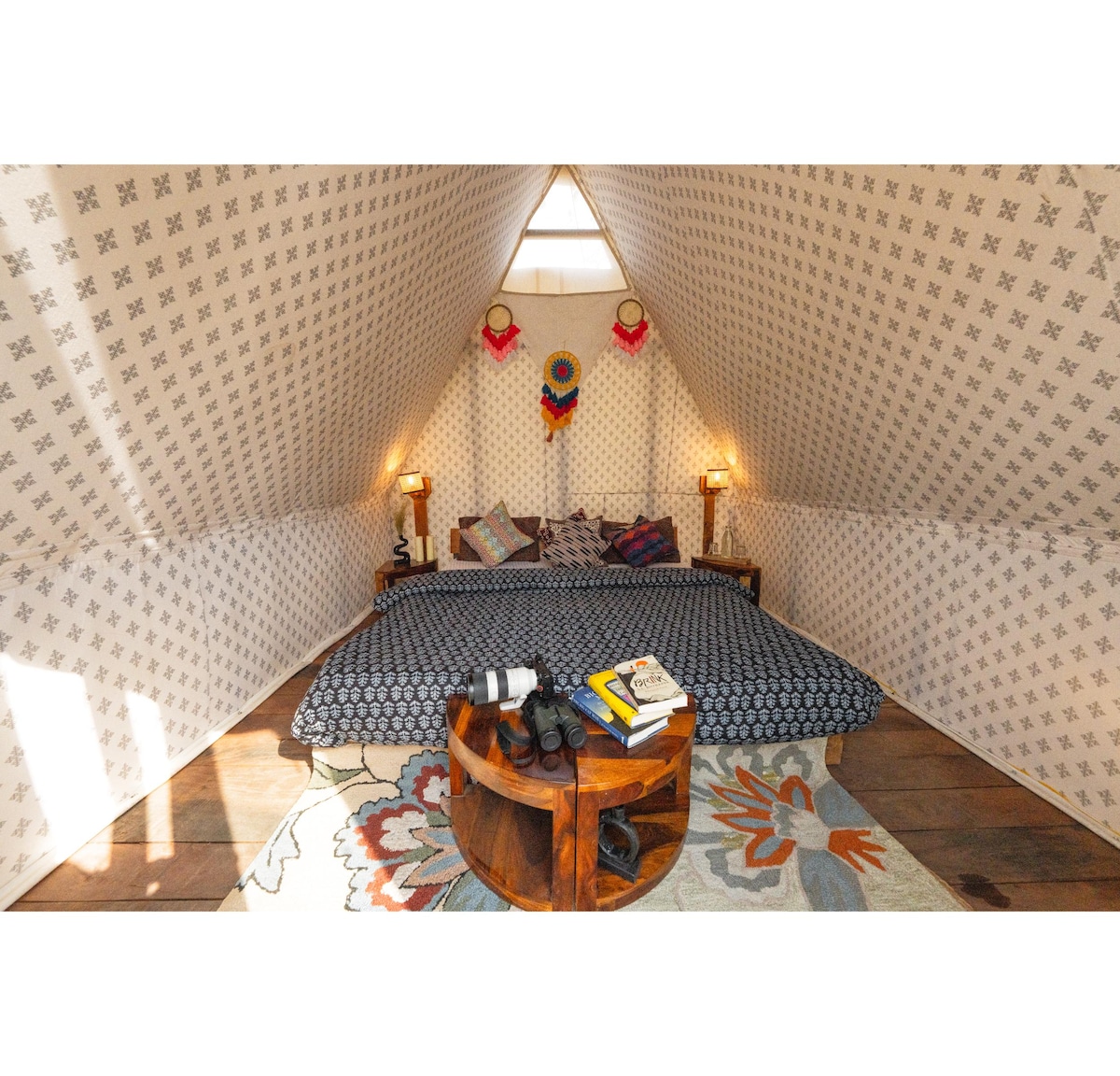 Experience a luxurious jungle stay in the heart of Ranthambore, where heritage elegance meets modern comfort. This spacious luxury tented cottage is thoughtfully designed with a royal touch, featuring a handcrafted four-poster wooden bed, premium linens, and warm ambient lighting that creates a cozy yet regal atmosphere.