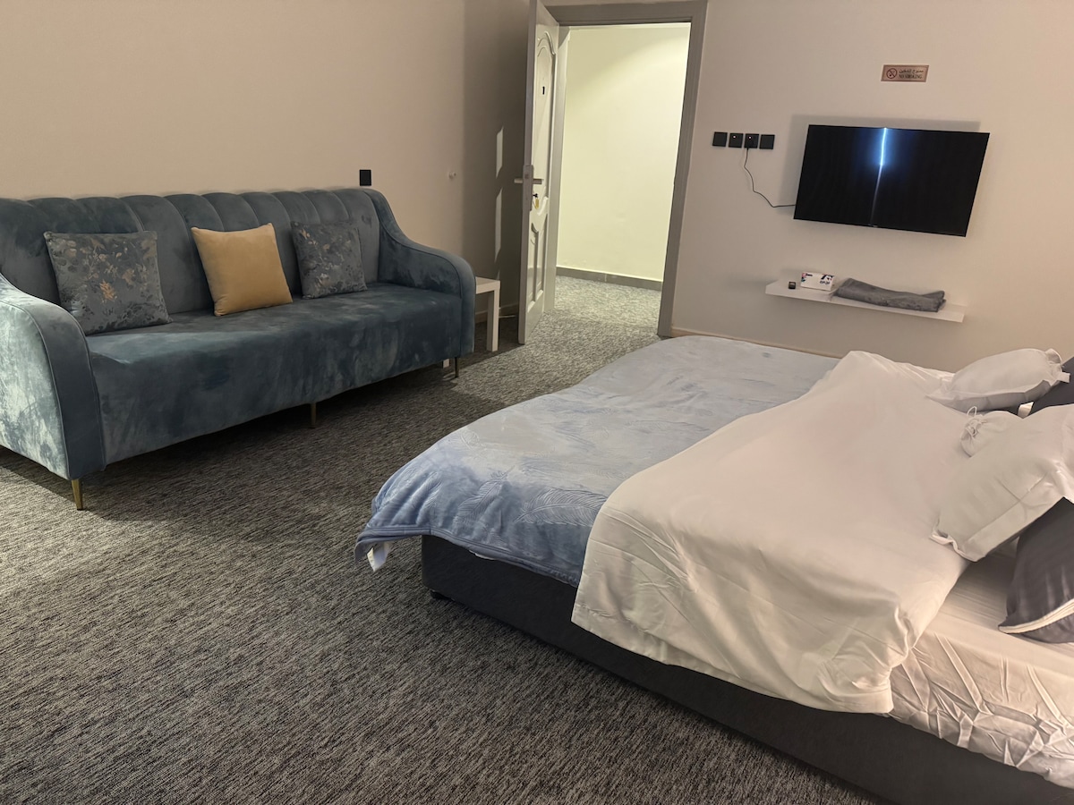 A new apartment located in the central area and close to all services. It is 8 minutes away from the Haram by car in normal conditions and 30 minutes on foot. It is only 4 minutes away from Sayyid al-Shuhada Mosque. It is located a 5-minute walk to the walkway leading to the Haram and Sayyid al-Shuhada.