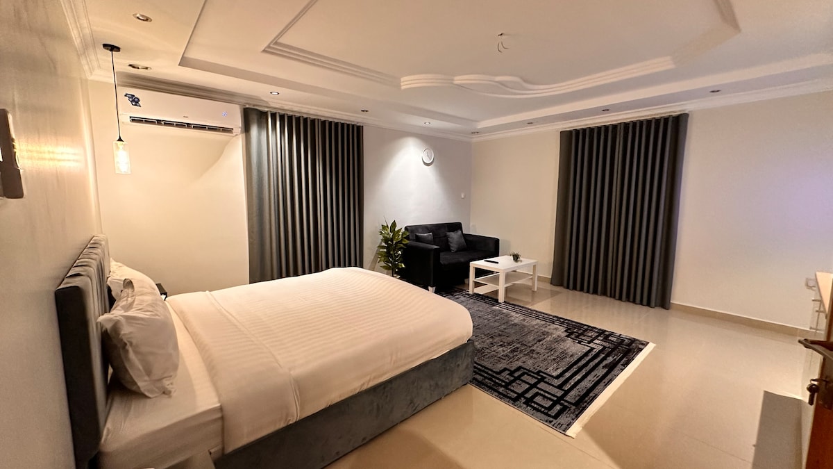 استوديو ماستر فاخر يحتوي على: • سرير ماستر مريح لضمان نوم هادئ. • منطقة جلوس أنيقة مع كنب مريح. • تلفزيون عالي الوضوح للاستمتاع بالمشاهدة. • ركن قهوة مجهز لتحضير المشروبات الساخنة. • مطبخ جاهز . • حمام خاص مجهز بكافة الاحتياجات من شامبو، صابون، وجل استحمام لراحة تامة. الاماكن القريبه منه : الحرم النبوي الشريف اقل من ١٠ دقائق محطة قطار الحرمين اقل من ١٠ دقائق مطار الامير محمد بن عبدالعزيز اقل من ١٥ دقيقة