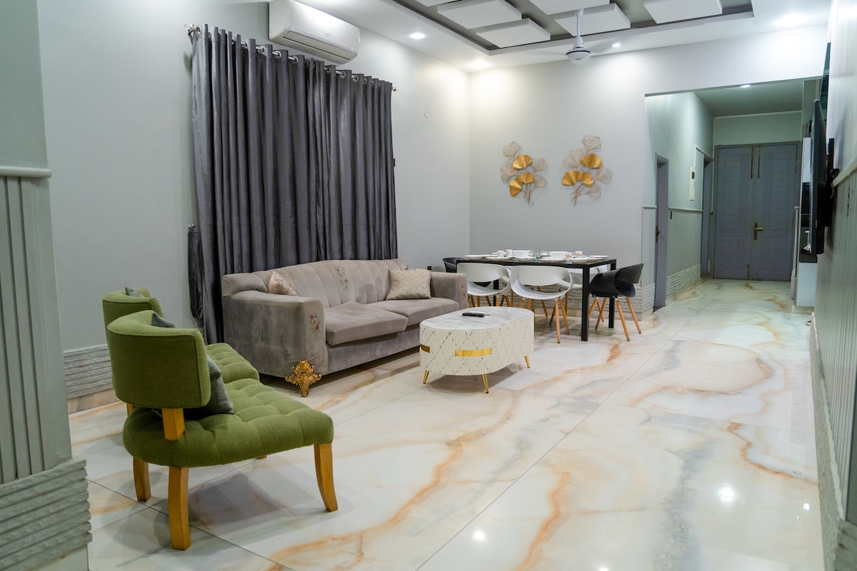Spacious 2nd-Floor Home on 600 sq yds with Terrace in Iconic Location. This space offers everything you need for a comfortable stay, including: •Two spacious rooms with 2 double beds and 1 single bed •Three bathrooms •A fully equipped kitchen •A dining & cozy sitting area. • laundry facility •Private terrace •Located near National stadium & Time Medico •Free parking & guard services This centrally located gem is the perfect choice for your stay.