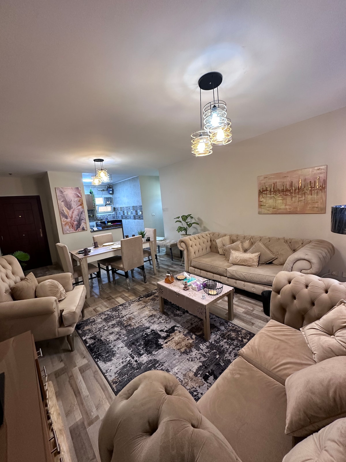 Newly furnished apartment with poho style -3 rooms every room with air conditioning one of them master room with balcony -view of the apartment so amazing you can see from all rooms the new capital towers and east hub mall -open amircan kitchen -kitchen and all reception with air conditioning - smart tv with netflix -Fully Equipped kitchen with everything you need to cook -Apartment location so unique you can go to mall by walk Coffee shops, restaurants, supermarkets, all clothes brands