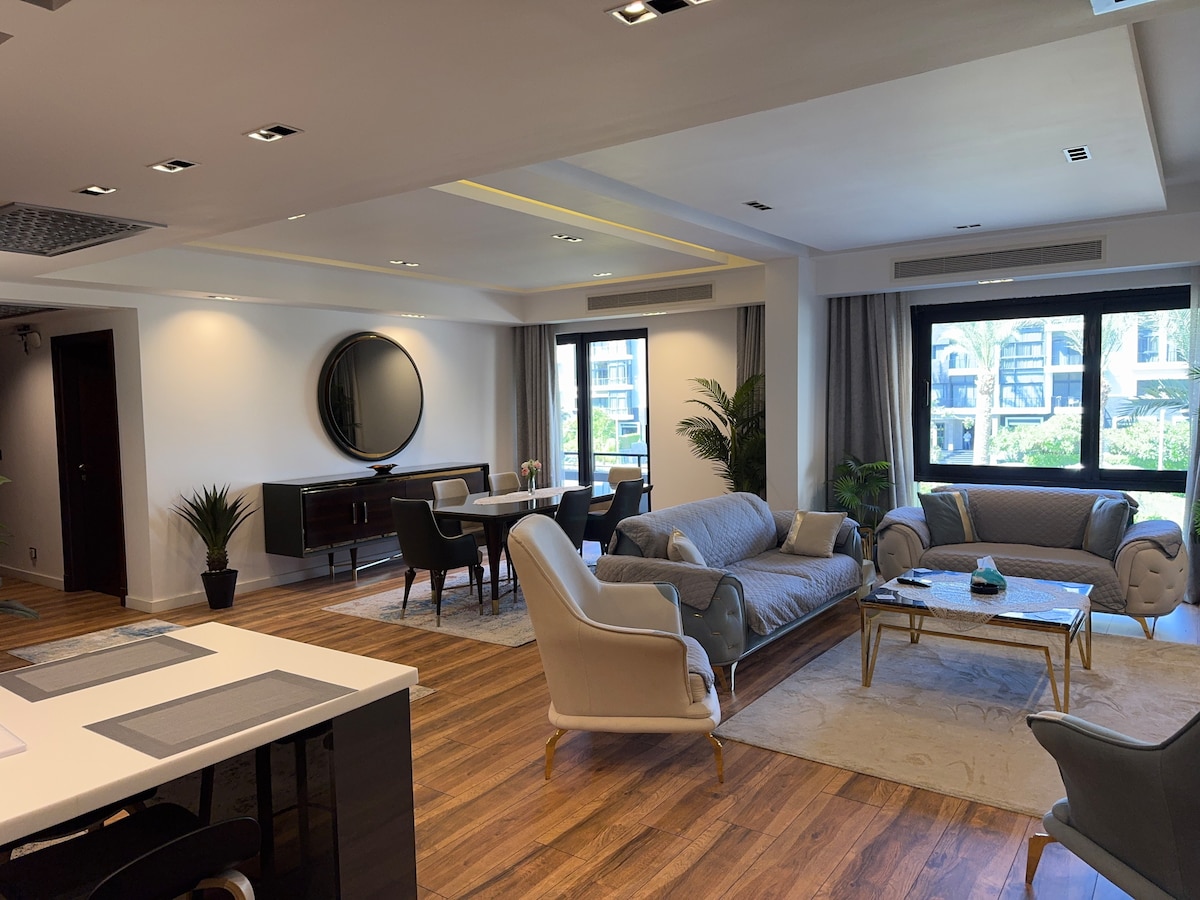 Ground floor haven that will keep you away from the busyness of Cairo, located only 1min away by car from Waterway 1. Bring the whole family to this great place with lots of room for fun. This simple 2 BR apartment features 1 king bed and two double beds with high-quality mattresses to give you the best sleep. A fully equipped kitchen and coffee machine to keep your taste buds occupied! 1.5 Bathrooms that are simple and has everything you need (hot showers, shampoo, shower gel and more)