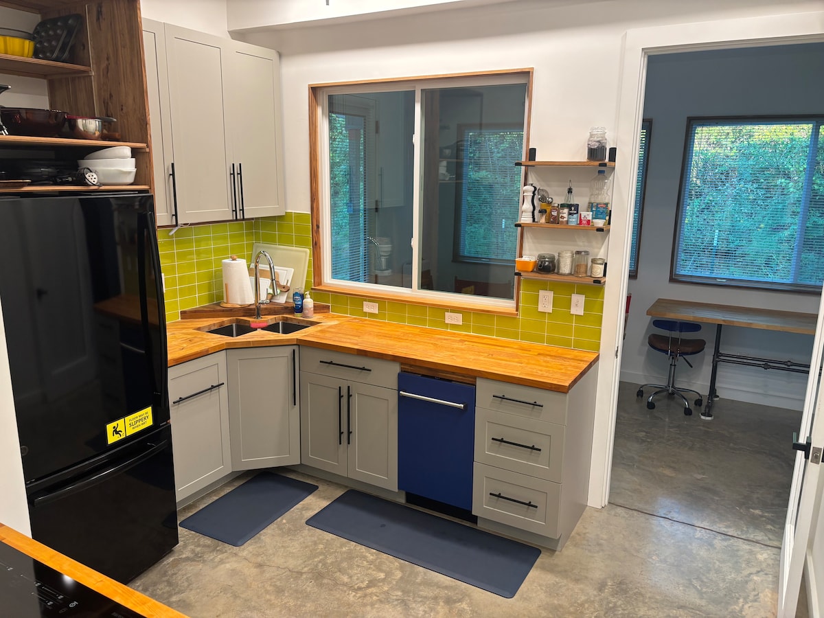 Now FULLY FENCED Tiny House w/Shady Screen Porch near Clift Farms restaurants Madison Hospital Self check-in anytime after 3 PM Private no direct line of sight to owner occupied areas. New Luxury furnishings: 12” pillow top queen mattress, gas appliances, Farmhouse copper sink, raised height commode Luxury amenities: crisp cotton percale sheets, “endless” hot water, cotton towels, Keurig coffee, ice machine, washer/dryer BBQ Grill Fire Pit