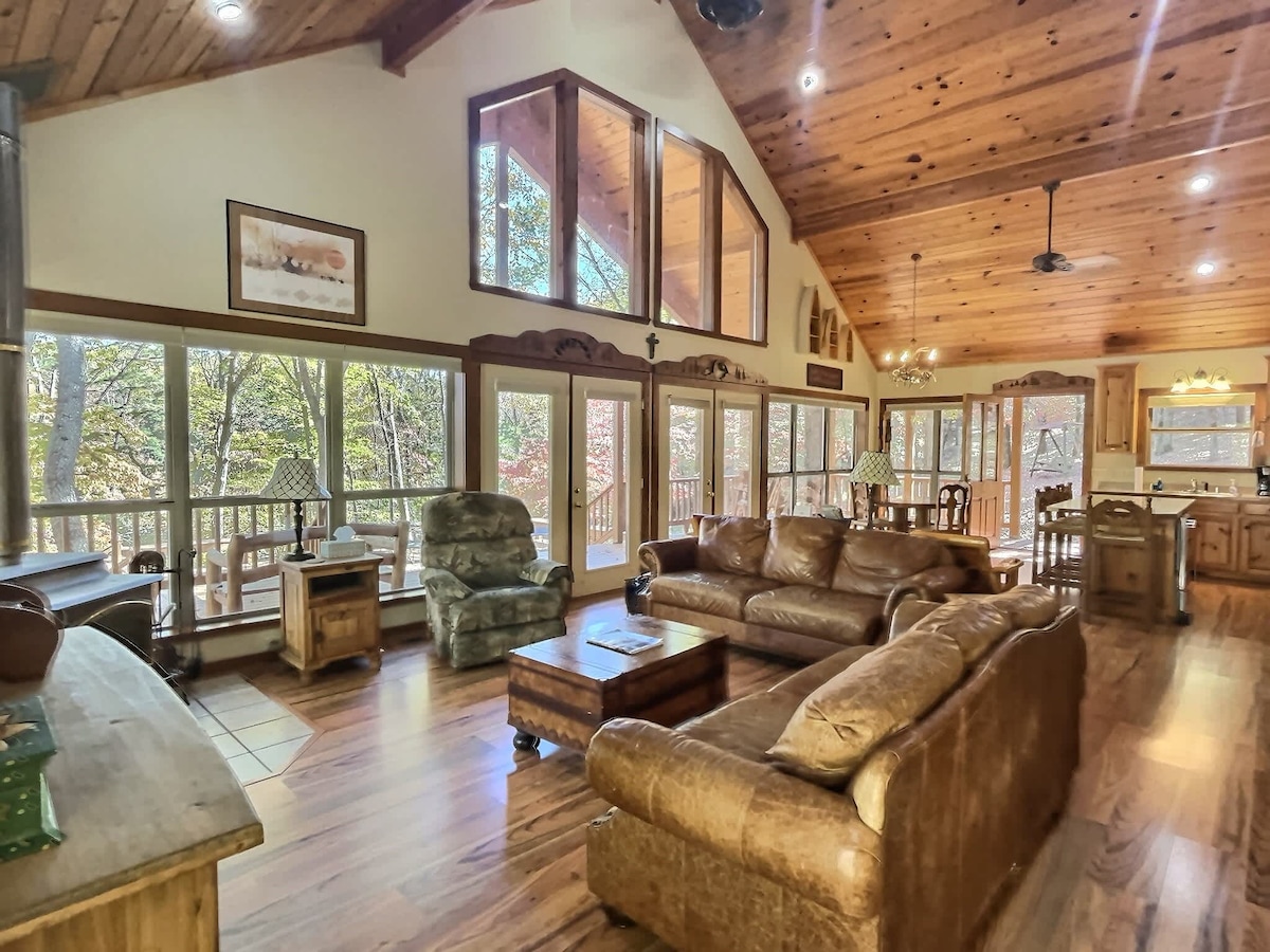 The Buckeye lodge is like new. Located 200 feet from the Sassafras lodge.Enjoy the river just off the back porch .You can access the national forest,miles of trails from my cabins. I have a five acre lake that our guest can enjoy. If you are an avid outdoors person or someone that enjoys just listening to the river cascade over the rocks with a good book this cabin is for you.We allow a maximum of two pets.There is a 25.00 fee per night per pet.