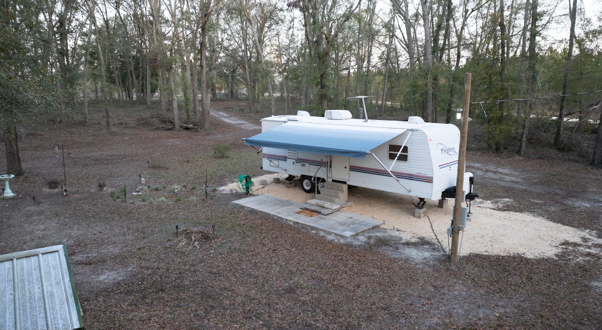 **Cozy RV Retreat on 14-Acre Family Farm** Nestled on a peaceful 14-acre farm near Blue Springs State Park, this fully loaded 34-ft RV offers a perfect peaceful getaway for nature lovers. Enjoy swimming, diving, kayaking, and fishing at Blue Springs, or explore nearby biking, horseback riding, and birding trails. Visit historic downtown Madison or the Edge of Town in Lee for fantastic antique shopping and a cold brew at the Bullpen. Ideal for relaxation, book your quiet adventure today!