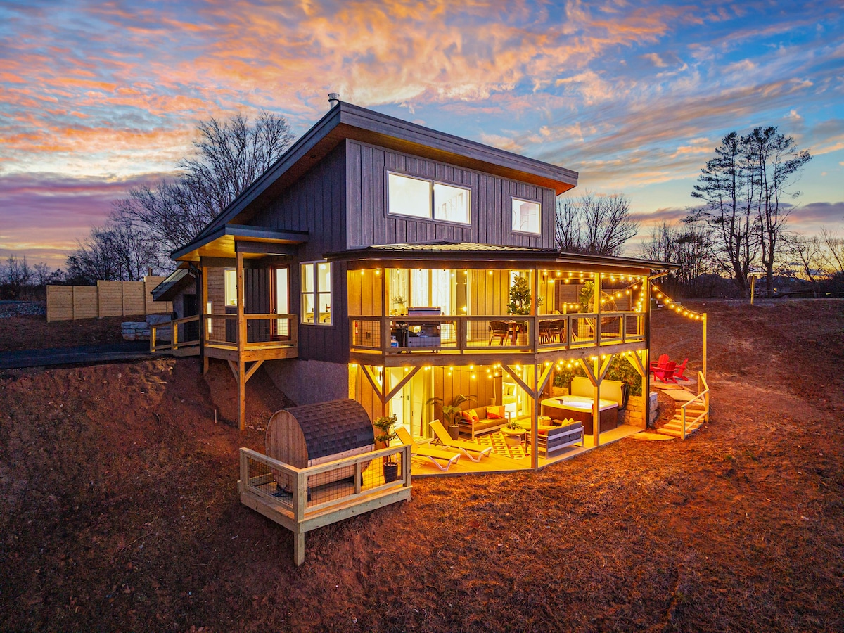 Relax at Everview--a professionally designed, cozy, family-friendly ski escape. Amenity packed new home is perfect for you, families, friends or couples. Comfortably sleeps 10 🌹 23 min-15miles to scenic Biltmore Blooms 🎮 2 Game rooms: arcade, ping pong & pool table 💦 Hot tub & barrel sauna for ultimate relaxation 🔥 Expansive decks with mtn views + fire pit ☕ Loaded kitchen, coffee/tea bar & flavored syrups ♿ Ramp, great for grandparents and strollers ⚡️~1K Mbps, work faster then 😌