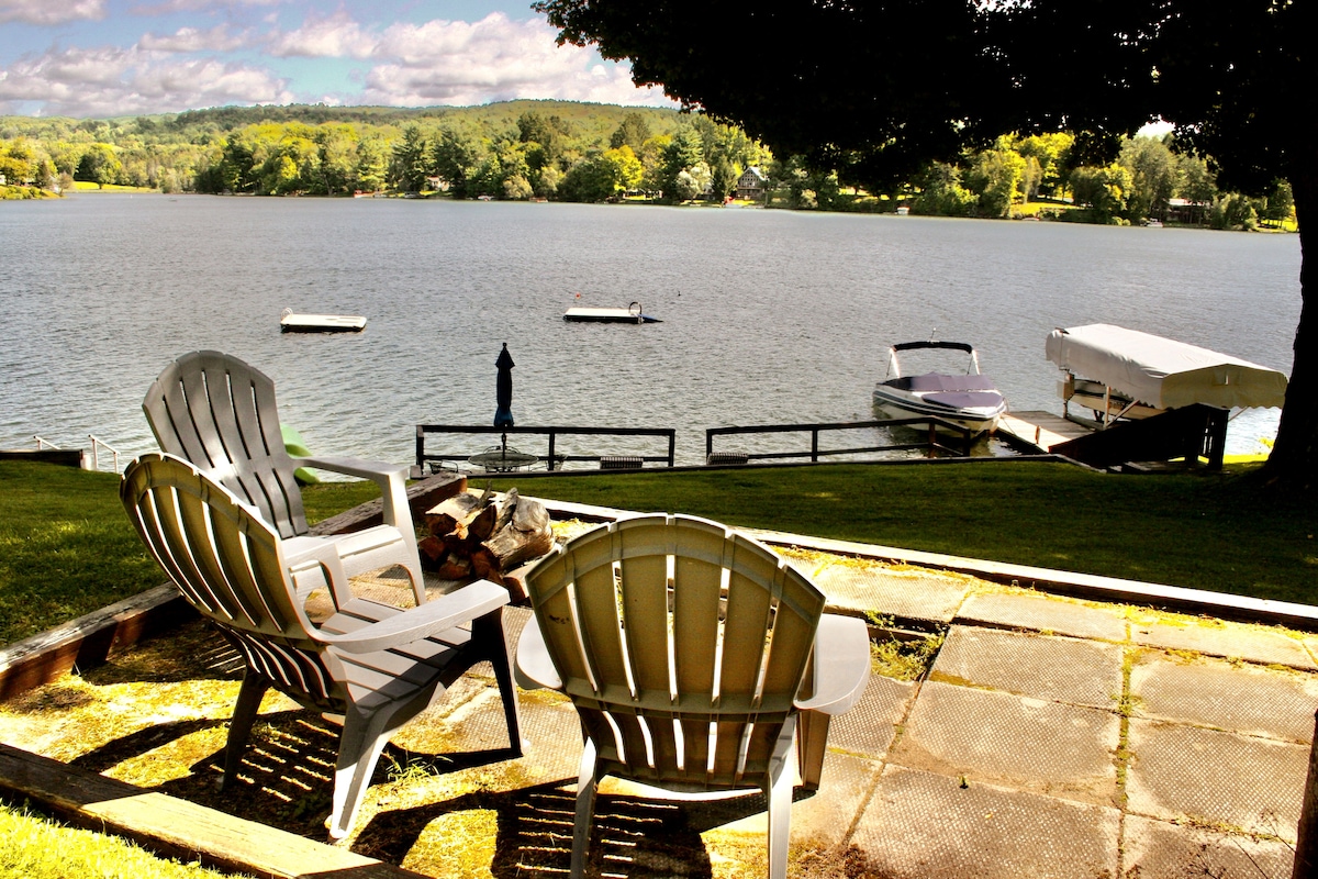 Pets stay free! Lakefront walkout basement studio apartment, steps to water. Greatroom with king & queen beds. On Lebanon Reservoir a few miles from Hamilton, Colgate University and Seven Oaks Golf Course. Room to dock your motor boat, kayak, fish & swim. Rental kayaks available within walking distance. Best view of the lake. Big starry night skys from your private outdoor firepit & covered patio with propane grill & plenty of seating.