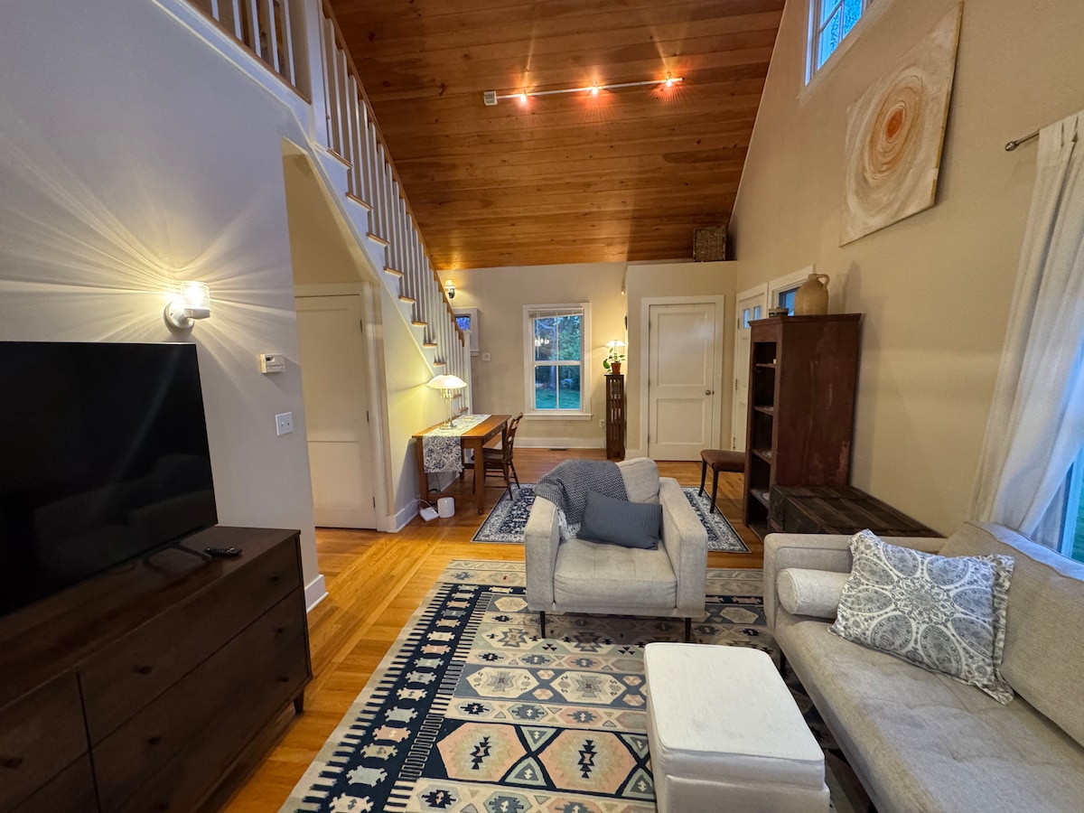 LGBTQ friendly. Our 1915 Arts & Crafts bungalow's spacious in-law suite offers driveway parking, private entrance, sunroom, king bedroom, en-suite bath, kitchenette w/fridge, micro, coffee maker, toaster. Relax in bed with 40" HDTV with Amazon Prime, HBO Max, Netflix, premium cable. Enjoy private gardens to sun, read a book or cup of coffee. Short drive to 4 Vineyards, Theater and the train station. I am not responsible for wifi.