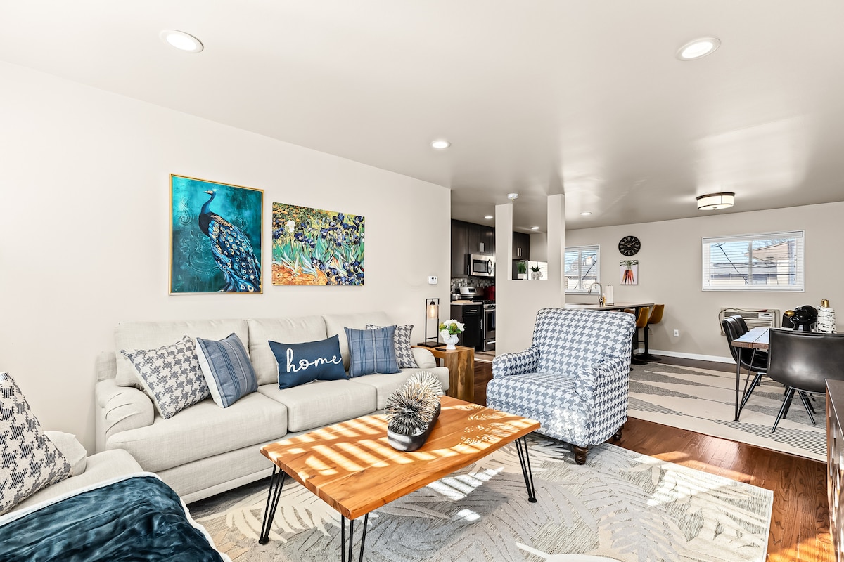 Ferndale retreat! This home has a living room for five (laying), a pro office, art-filled walls, premium sound, wet bar, and a fully equipped kitchen. Walk or bike to downtown, a brewery, and jazz club. Includes 6 kettlebells, 350 G Wi-Fi, 2 Smart TVs, 2 bikes, 2 air beds and laundry. On-site dance classes available for $40/hr on Tue/Fri from 7-9 p.m. and Sat/Sun from 10-12 a.m. and 7-9 p.m. Espresso For show only. Baby gate for basement. May need to move wet bar for kids.