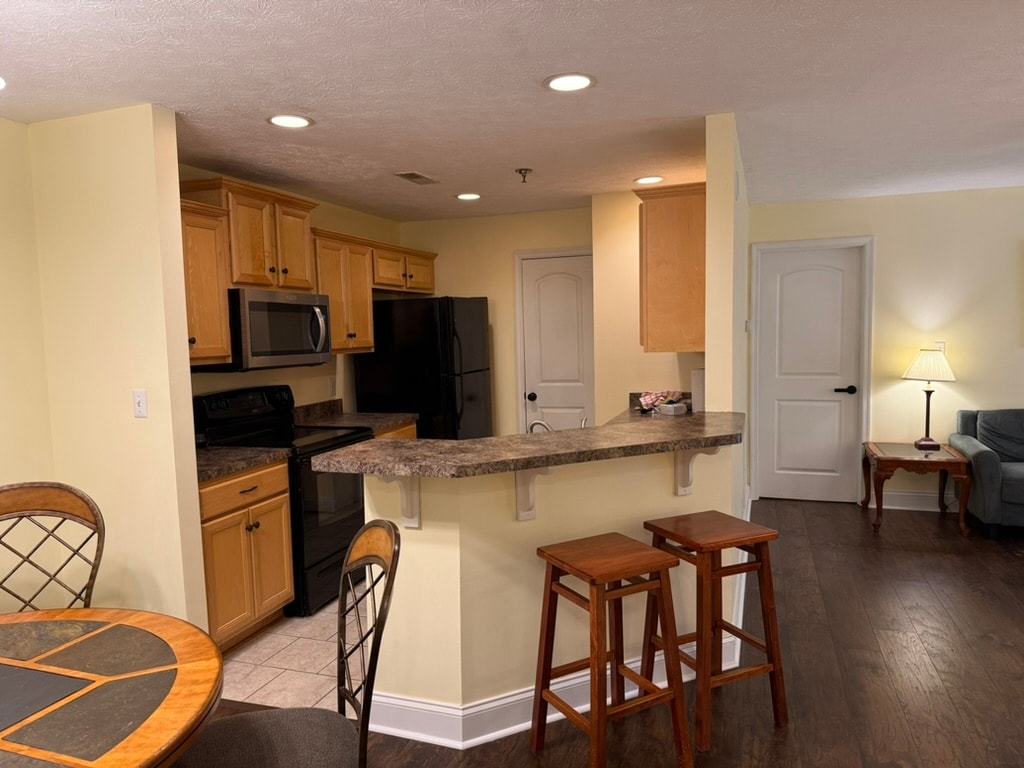 One bedroom/ terrace apartment. Apartment has a full kitchen and deck area. There is a private parking space (room for two cars) and private entrance. The bedroom has a full bed. There is also a full air mattress for extra guests. The bathroom is off of the bedroom. We are about 6 minutes from Liberty University, 8 minutes from the airport, 15 minutes from Lynchburg College and 20 minutes from the hospitals. Discounts are given for stays seven or more days. The television is a Roku.