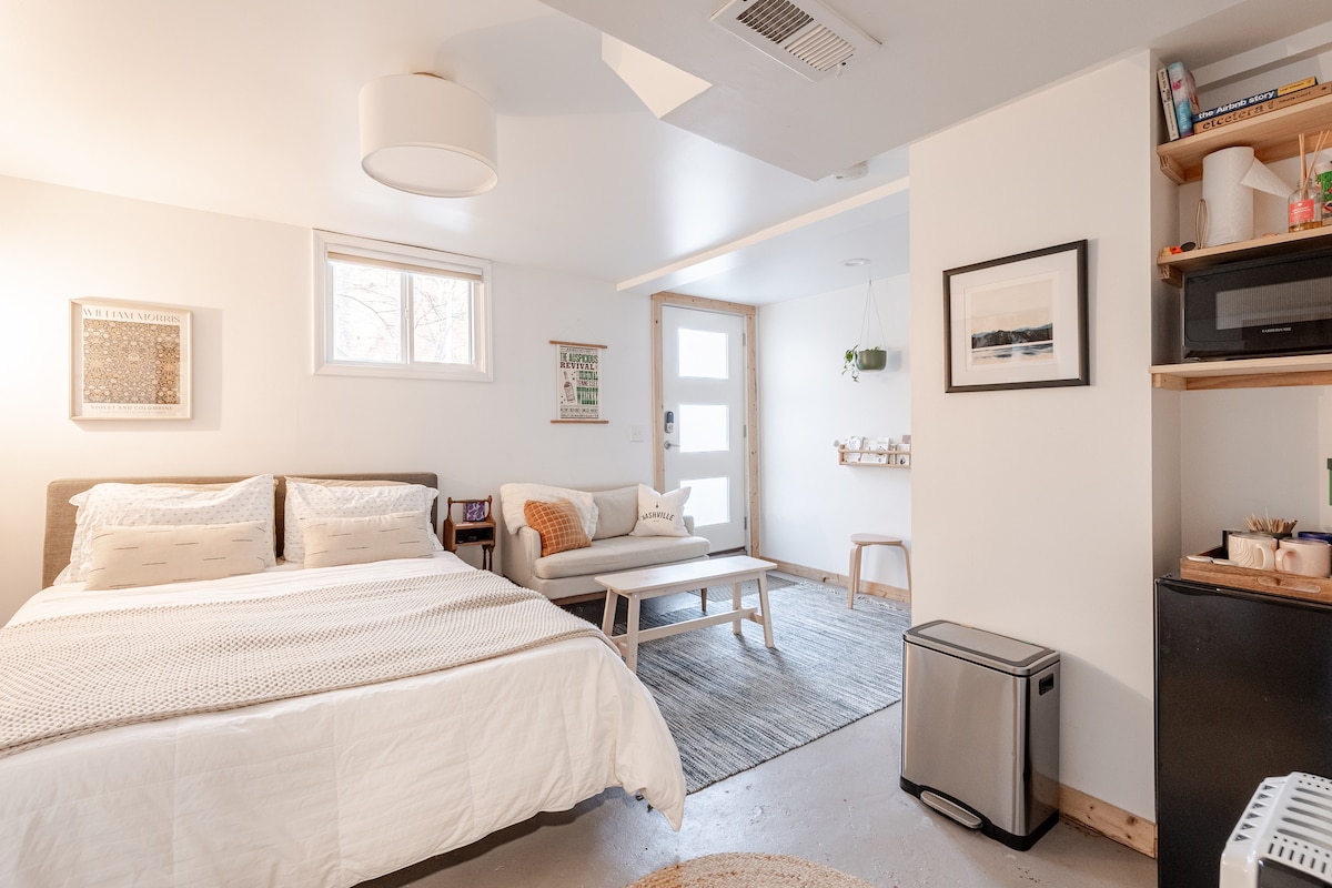 We recently finished the renovation of our house, which includes a cute, cozy one bedroom guest suite. Guests will have access to their own private entrance via their own 16 x 24 foot deck. The suite includes a bedroom with blackout curtains, a sound machine, bathroom with a bathtub/shower combo, kitchenette (full size fridge, sink, dishwasher, induction burners, toaster oven, microwave), dining table and a living space with a couch, reading nook and TV.