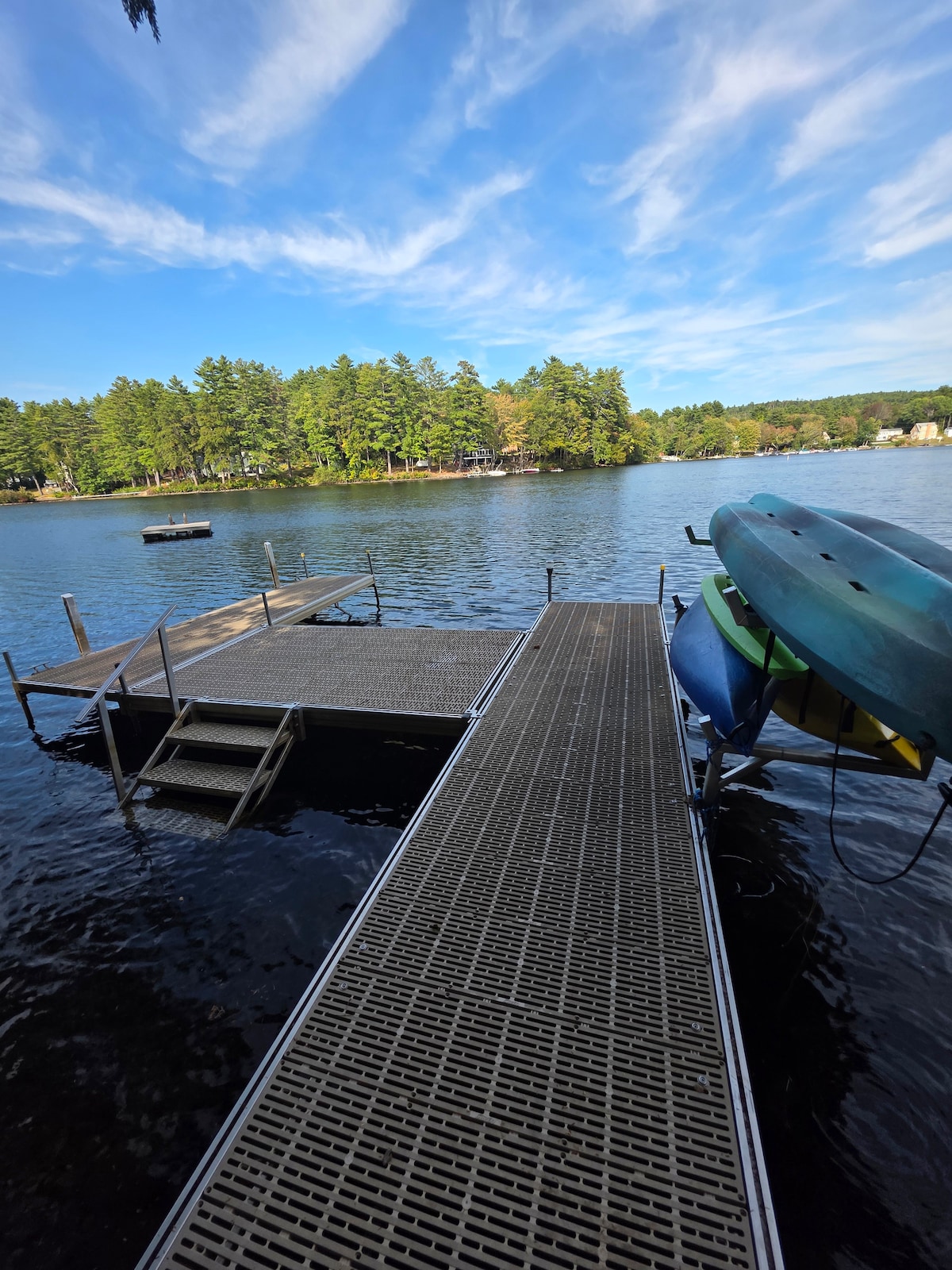 Escape to a peaceful, lakeside retreat with a secluded sun-lit deck and private dock with incredible views of Sunrise Lake, plus a 4-person hot tub, and seasonal amenities like a pedal boat, two kayaks, a SUP board, gas fire table, central A/C, a pellet stove, and snowshoes. Enjoy nearby activities like hiking, leaf peeping, skiing, and visiting scenic towns, local vineyards and breweries — or simply relaxing in a beautiful lakefront setting. The sunsets can be unbelievable!