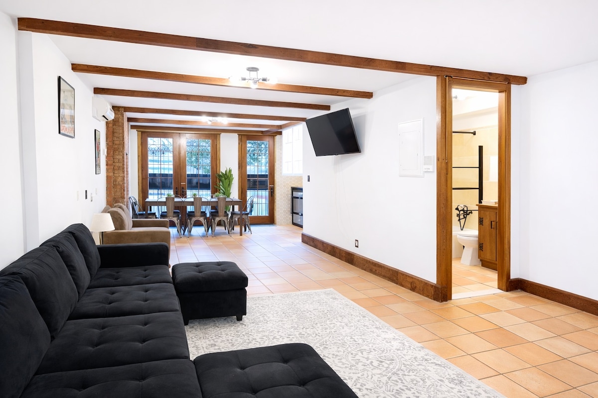 Bright and spacious all private 1-bedroom apartment with a full kitchen, large living room, full kitchen 1 full bathroom and private backyard — just steps from Central Park and the subway. Ground-floor unit with a private entrance, fast Wi-Fi, stylish décor, and pet-friendly comfort. Perfect for couples, solo travelers, groups & families.