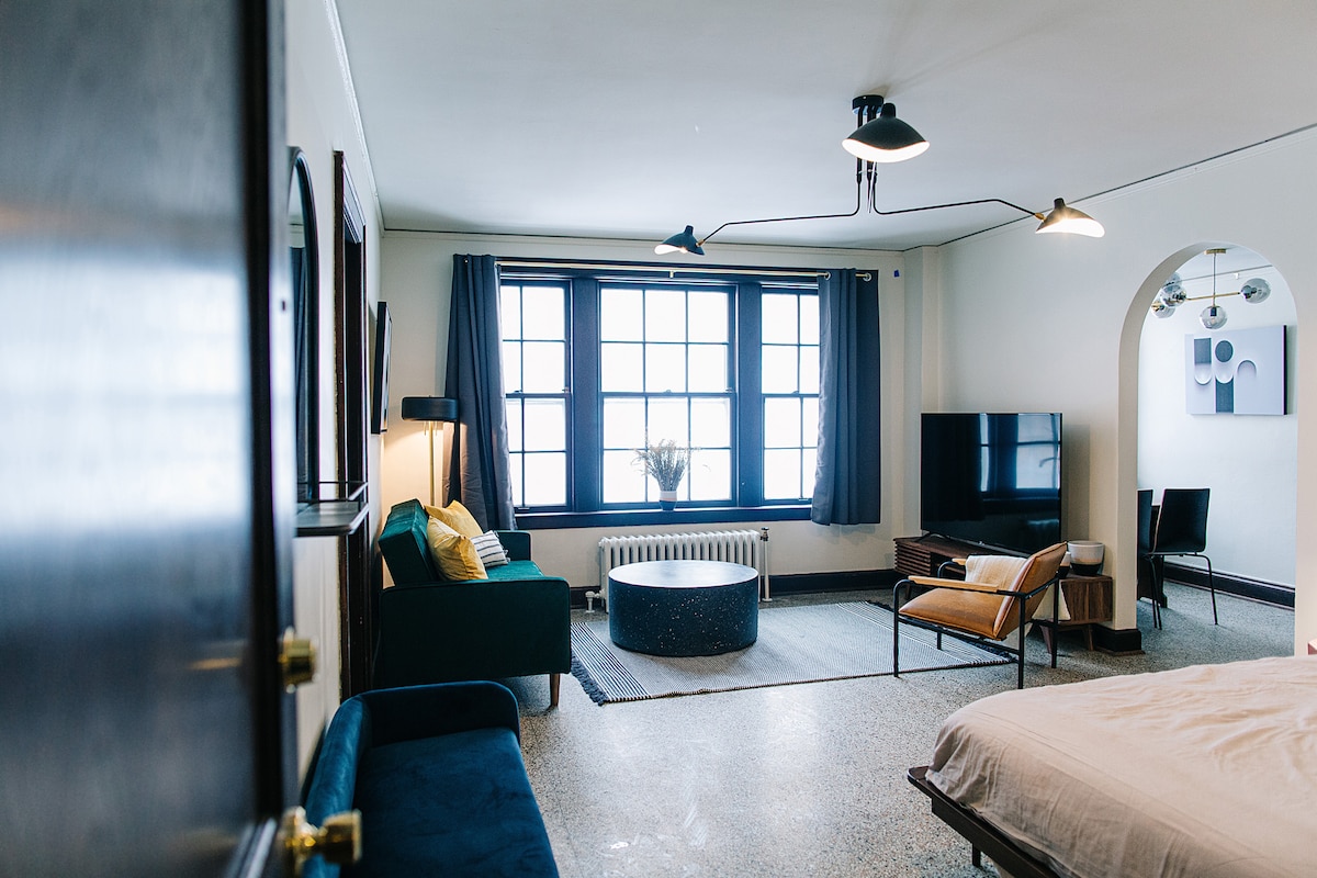 Located within The Wilson, this spacious third-floor corner studio features windows on two sides. Historic charm pairs with everyday comfort, plus a dedicated vanity for easy getting ready. Situated on the alley side, occasional early-morning city activity may be heard. Guests enjoy access to the shared rooftop deck overlooking nearby dining and nightlife. Hosted by a local husband-and-wife team passionate about thoughtfully curated spaces. Third-floor walk-up with paid parking nearby.