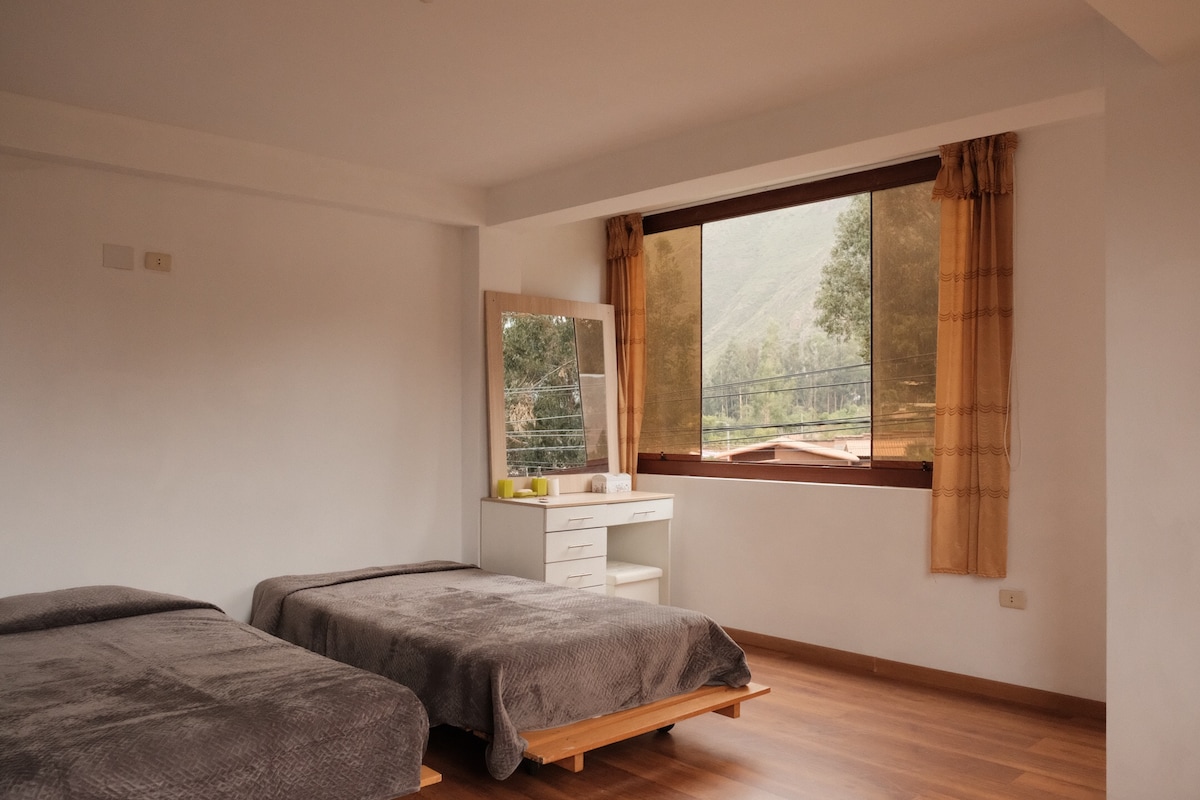 Lovely 3 Bedroom Apartment located in the 3rd floor with view to the mountains. Each bedroom has their own bathroom with hot water and very nice pressure. There’s a full equipped gym on the 5th floor. All the bedrooms are spacious and have big windows so it’s very illuminated. There’s a big garden where you can made fire. It’s 7-10 minutes away from the center of Urubamba by car or mototaxi. It’s equipped. Electrical heather optionally.