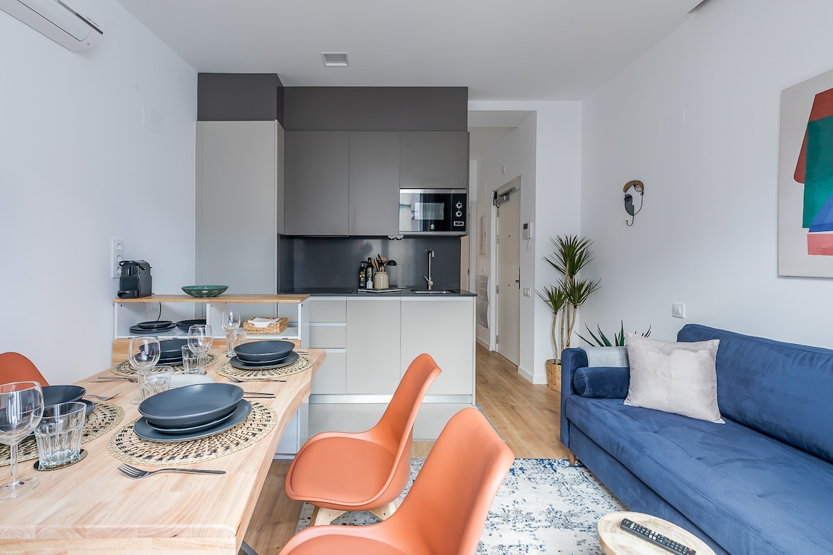 Magnificent 45 square meter apartment in the heart of Madrid. With spectacular design and decoration, spacious areas, and high ceilings, the apartment is equipped with everything you need for your stay in Madrid. The living room has three balconies overlooking the street that provide great brightness to the flat. The bedroom has an en-suite bathroom and a work desk. From the apartment, you can walk to almost all the iconic points of Madrid.