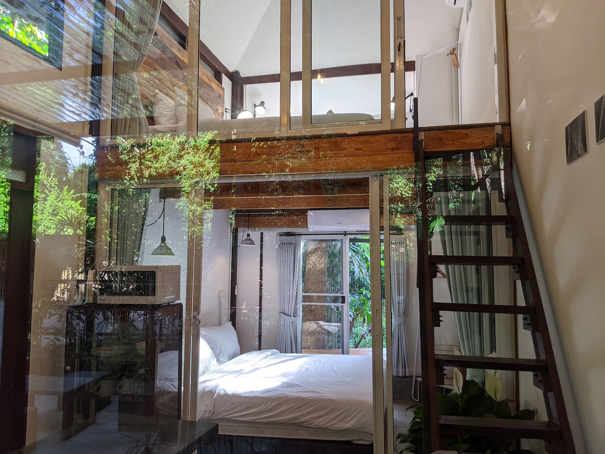 The terrace wood house with simply style is filled with light and views of the trees. It has a front deck, dinning loft, two bedrooms with relaxing terrace and balcony window, and a bathroom with separate toilet room. Live in close proximity to the city center and the beauty nature. Experience staying in a small community, interacting with local people, and eat a variety of local foods. Enjoy coffee from our cafe, biking through the beautiful bicycle route, and explore community art spaces.