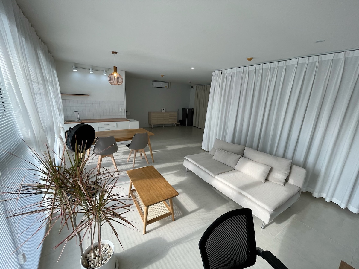 The design of the villa is inspired by Wabi-sabi style. Wabi-sabi home is one that embraces authenticity, finds value in the lovingly weathered and lived-in, and promotes an overall sense of peace and tranquility using simplicity. Light wooden teaks were used throughout the design to set a natural and relaxing atmosphere. - The pool is 8x3 m. which is very big for a couple. - Quility bedding, King size bed - 65" smart TV. - working table - comfortable seating area (for TV) - sun bathing chairs