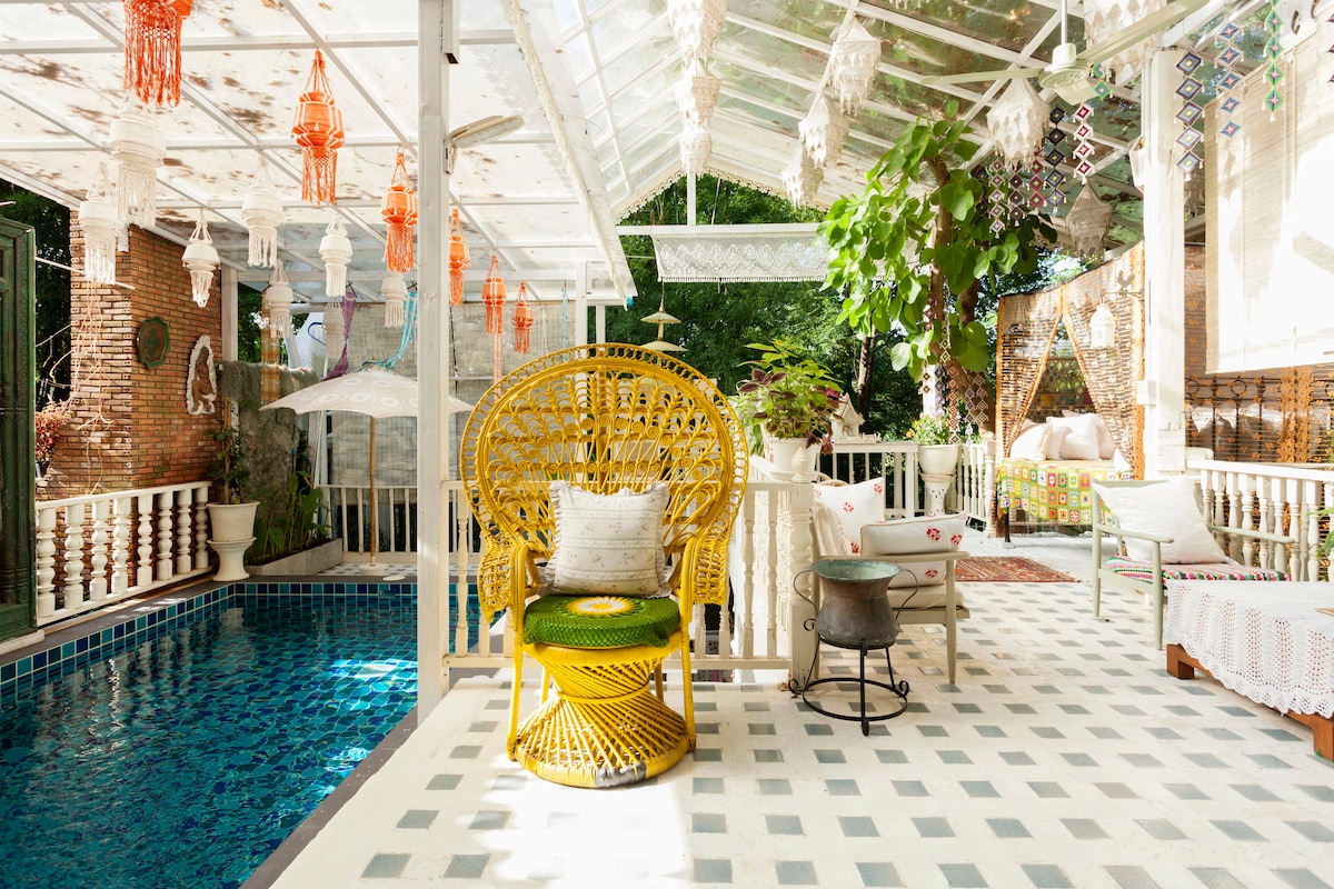 This unique home is situated in lush, green privacy on the Ping river, minutes to Thapae Gate, shopping malls and the Nimmanhaemin area. There are two bedrooms with en suite bathrooms, covered outdoor decks & a pool. It's a perfect get away for couples, friends and family. All bedrooms have air conditioning, WiFi and cable TV. We offer a free pick up service from CNX airport, bus/train stations and 5 km from central Chiangmai Additionally: astrology readings are available on request.