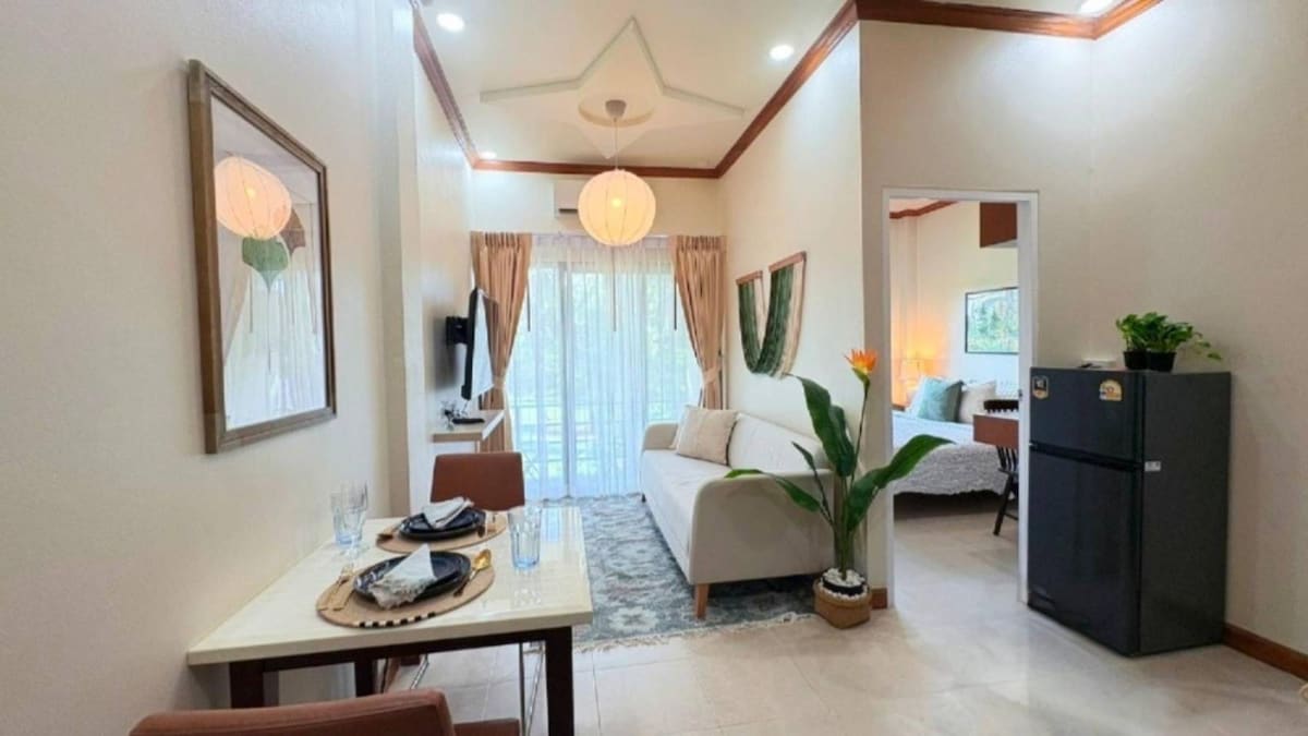 An aircon Wifi Ensuite bungalow with view of garden and the sea from its balcony, seconds to the beach and around 7 minutes to the mountain by foot, enjoy beach & hiking activities in one spot. Bus stops and Free parking lot nearby, short walk to money exchange, 24 hour convenient store 7/11, shops and restaurants, etc. Share Kitchenette and meet other international travellers. Bring along the Airpods to keep undesirable noises away. Please note, No stove for cooking.