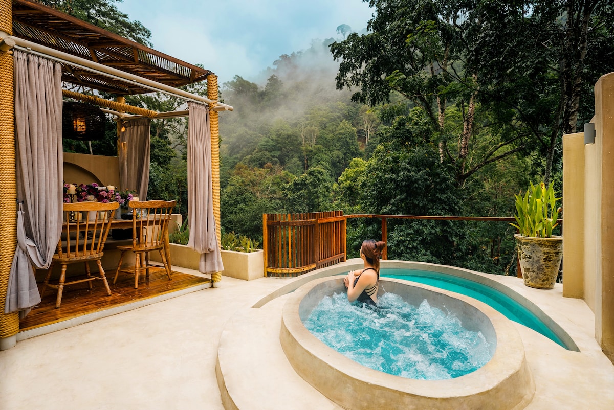 Garden view One-bedroom villa with a rooftop jacuzzi. Surrounded by nature with blue sky by day and stars at night.