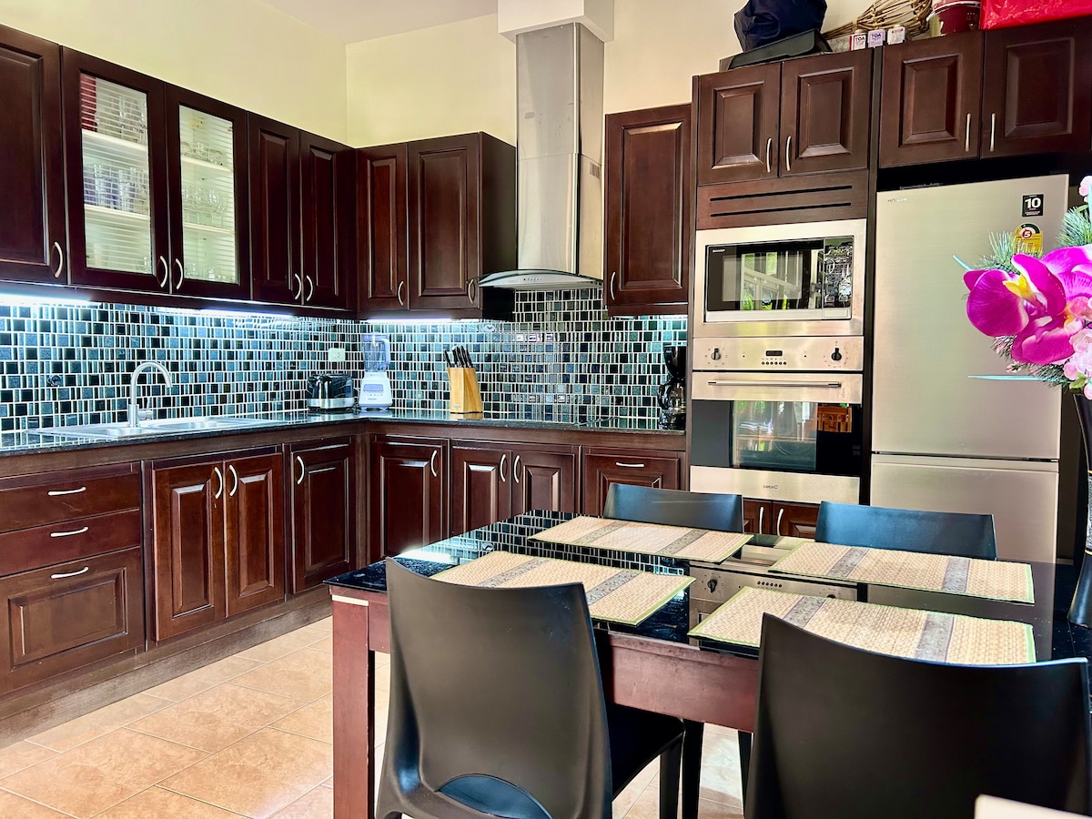 Beautiful beachfront house on the Eastern Thai coastline facing stunning Koh Samet and Koh Kam islands just two and a half hours drive from Bangkok Suvarnabhumi Airport ( Bangkok) and 1 hour drive from Utapao Airport ( Pattaya). 3 comfortable bedrooms with bathrooms. Fully equipped kitchen with exterior BBQ. A large swimming pool with jacuzzi and area for children, tennis court, security guard 24/7 and much more. Breakfast is available on request but at an extra charge per guest will apply.