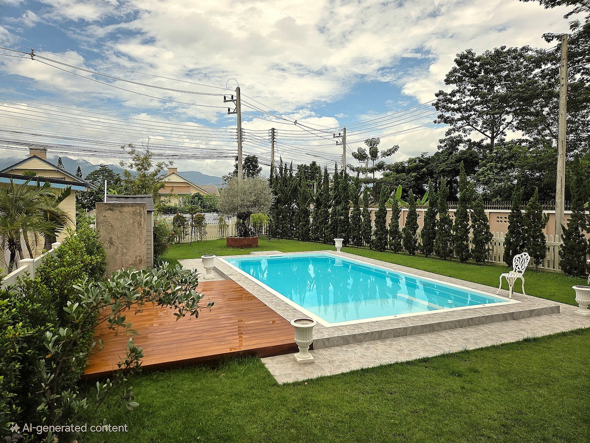 situated in a tranquil gated community north of Chiang Mai you will find your haven of peace. An excellent starting point for your family holiday in/around Chiang Mai. A Private swimming pool surrounded by a pleasant garden with ample sitting will put smiles upon your faces. The roomy living/dining room opens up to 3 bedrooms. (master: double bed, secondary: double bed, spare room: bunk bed) New mattresses!. Fully equipped kitchen, new washing machine and dryer, garage with EV charger.
