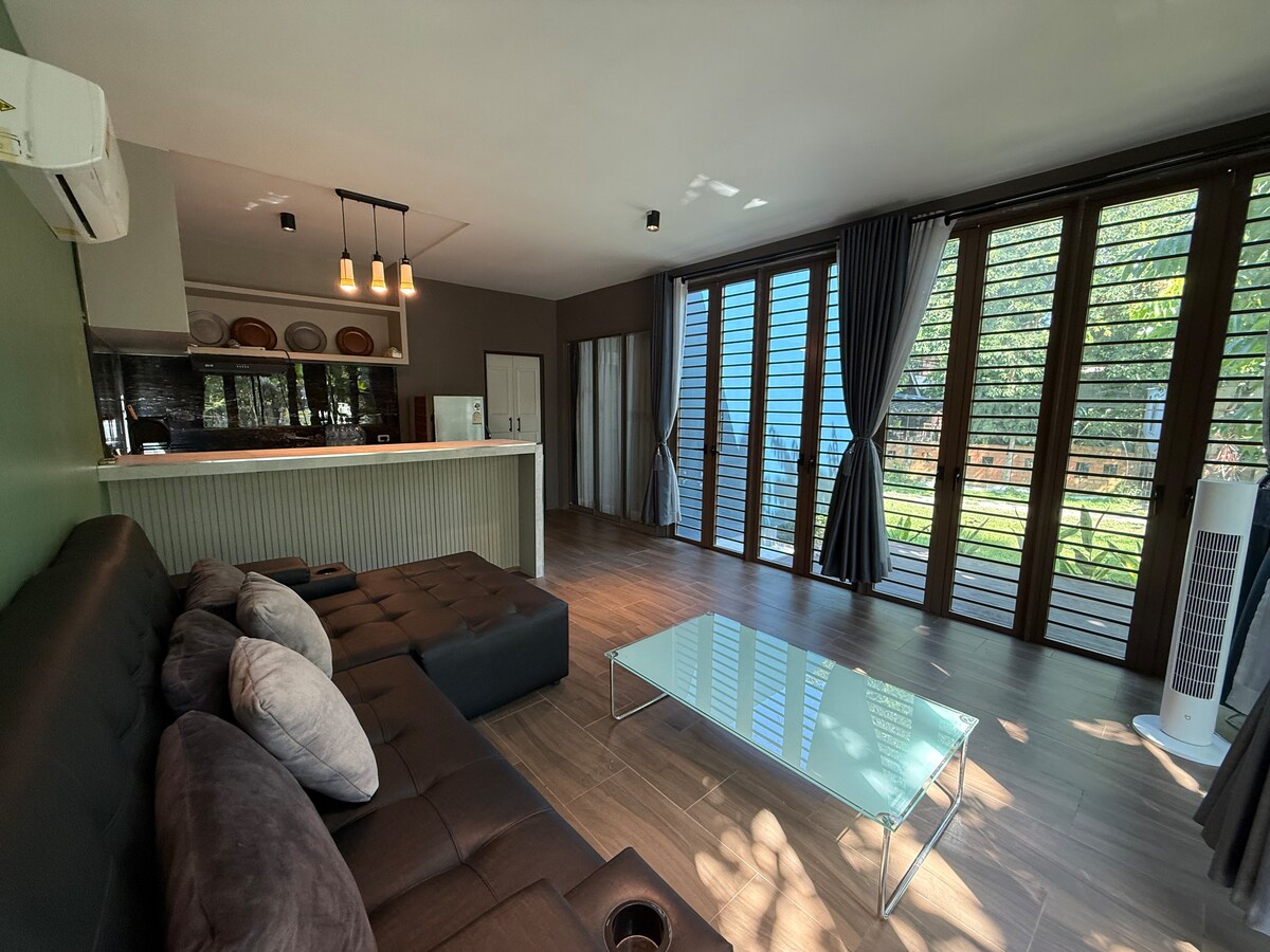 Work and play within this secure beautiful location. Enjoy sunrise at a large terrace with an amazing pool view and sunset by Mountain View. The 90 m2 loft (private kitchen and bathroom) is located on the top floor of a creative workspace, which easily transforms to a gathering area hosting various events Wifi, A/C, pool and gardens provide the perfect spot just for you. Located 6.7 km from the old city, there is a fresh market, coffeehouse, bars, restaurants, 7/11 within reach.
