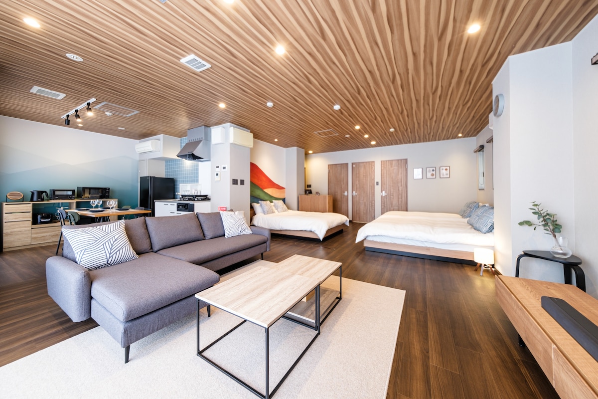 【Jomo Stay Takasaki】 北関東の玄関口「高崎駅」から徒歩3分という便利な場所に、山と自然を感じられる70㎡の広々ワンフロア空間。 ベッドはダブル1台(シモンズ製)とセミダブル2台をご用意。エクストラのシングルマットレス2組を使えば、最大8名の家族・グループ旅行にも対応。 内装は群馬の象徴「上毛三山」をイメージし、木製インテリアと組み合わせて群馬の自然を表現しました。 大空間LDKでは4Kプロジェクターと100インチスクリーンで映画や音楽を楽しめます。高速Wi‑Fi完備なのでビジネス利用やリモートワークされる方も快適。バスルームのReFaのシャワーが1日の疲れを癒します。 宿の徒歩圏内に高崎OPAや高島屋などのデパート、カフェや高崎グルメが楽しめる飲食店、イベントが開催される広場や公園が点在し、利便性は抜群。 群馬・高崎は、音楽・映画、自然、パスタの街。高崎芸術劇場、Gメッセ、高崎アリーナでのコンサートやイベント、近郊の榛名山・榛名湖、伊香保温泉、富岡製糸工場、少林寺達磨寺などへの旅行の際に、ホテルとは一味違った体験をお楽しみください。