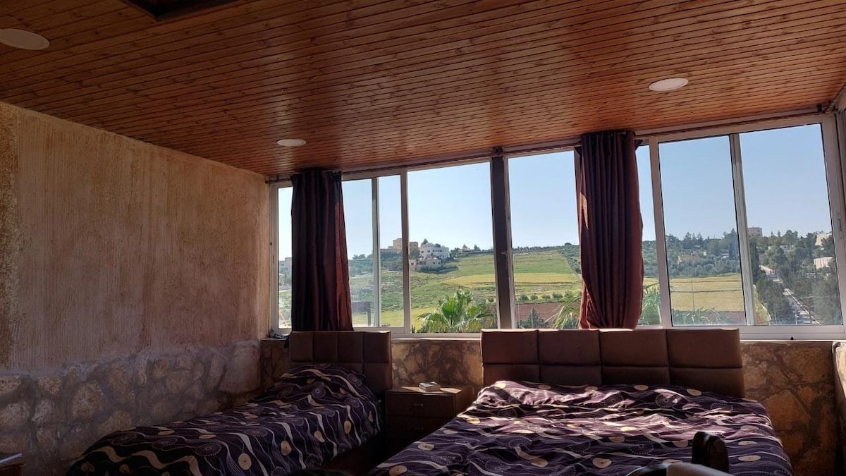 Relax at this new and gated upper-level villa far away from the city - Short drive to Ma'in Hot Springs, Mount Nebo, and town (Madaba) - Fully equipped home/kitchen - Built in 2021, new furniture, and appliances. - Private and large balcony with breathtaking views - Large living room - 2 bedrooms (3 beds: 1 queen and 2 single) - 1.5 Bathrooms - TV, Air conditioning (in each bedroom) - Large area for parking (covered and gated) - Very safe area and Staff are available 24/7.
