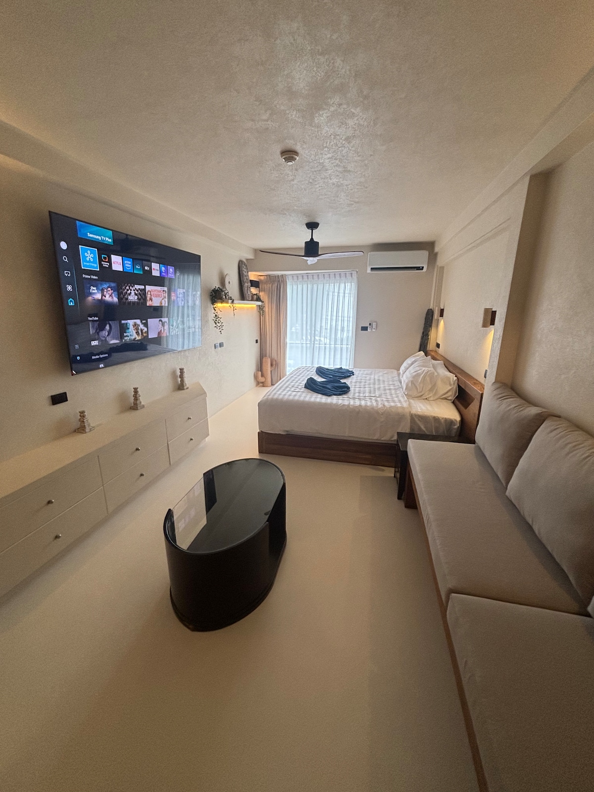 * Romantic, serene and peaceful environment 2 km from where HBO Max's filmed their hit show "White Lotus" season 3. * Just a 20-second walk to a beautiful, calm, sandy beach * Reliable and very fast WiFi Internet 100+ Mbps), AirCon, Hot Shower, 32" flat screen TV * Full Kitchen * Sea-View * King size bed + sofa-bed (linens for the sofa bed included with bookings for 3+ guests) * Walking distance to many restaurants, shops, yoga, laundry, fitness & main road * Motorbike & car rentals available