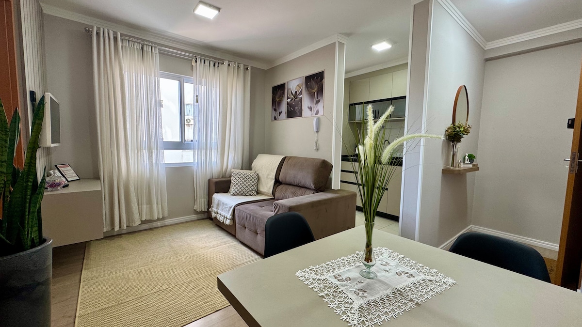 Localizado em área nobre de Mafra, próximo a Faculdade UNC, ideal para família. Cozinha ampla e equipada com tudo o que vc precisa. Sendo uma suíte cama queen( de alta qualidade). O outro quarto é grande e confortavel, cama casal com roupeiro e um banheiro social. A sala possui sofá cama, tv smart e tvc a cabo e mesa para refeições ! Wi-Fi de alta velocidade. Toalhas /Enxoval completo . Estacionamento em pátio fechado, seguro!