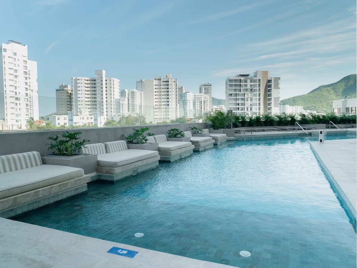 Situado en lujoso y privado Hotel Boutique en el centro Historico de Santa Marta, esta es una amplia y luminosa suite de 40m2, con 1 cama King Size o 2 camas individuales (solicitud con anticipación por mensaje) sabanas 100% algodón, Cortinas Blackout, cocina básicamente equipada, mini bar, microondas, Maquina Nespresso, aire acondicionado y productos de aseo. Ofrece también Smart TV - Netflix, internet- wifi gratis en todo el establecimiento. Areas sociales con 2 piscinas.