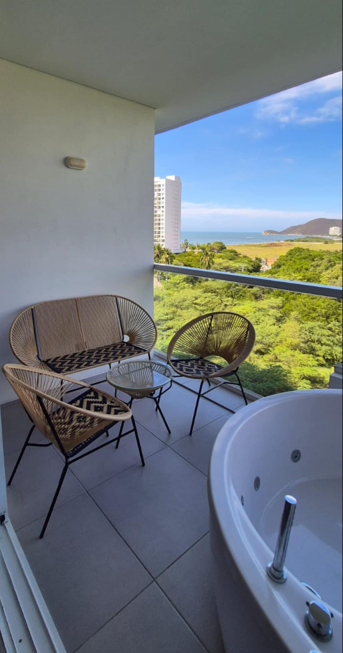 Espectacular apartamento moderno para estrenar en un piso 17 con vista al mar y salida directa a la playa. Espacio agradable para tomar vacaciones, descansar y/o trabajar home office. A 10 minutos del aeropuerto internacional y del centro histórico de Santa Marta, cerca a zona de restaurantes, bares, centros comerciales y farmacias. A menos de una hora del Parque Nacional Tayrona, Taganga, Minca. El apartamento cuenta con un amplio balcón donde podrás disfrutar del mejor atardecer de Colombia.