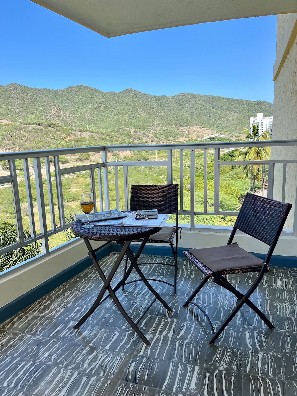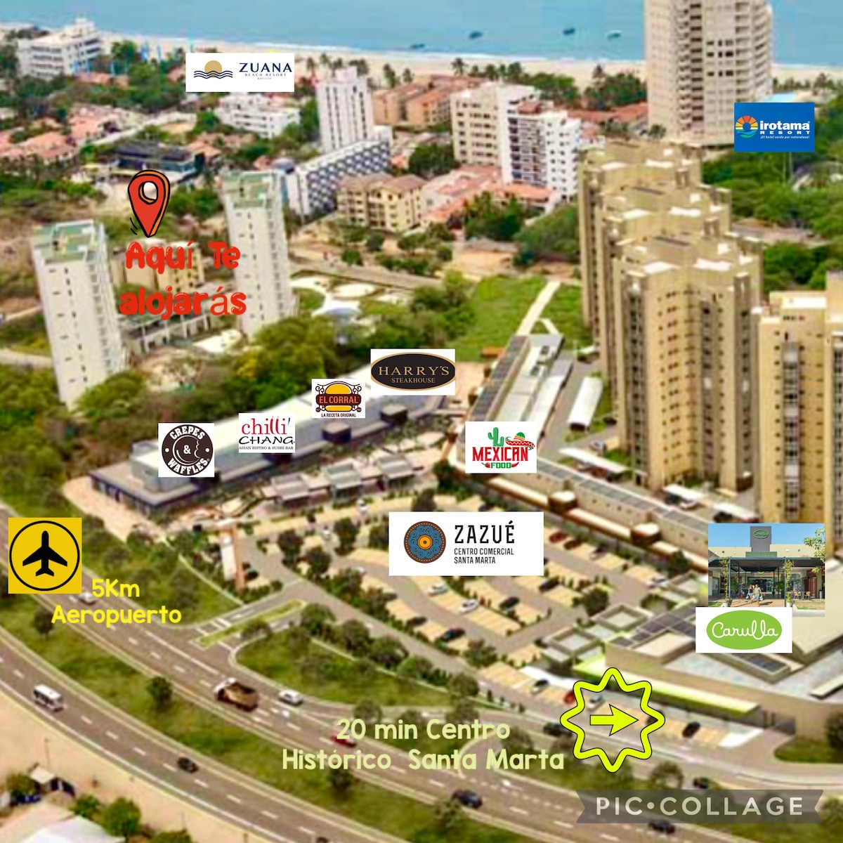 Una ubicación privilegiada, con una de las mejores playas de Santa Marta su arena blanca y amplia. Acceso directo al centro comercial Zazué, con mall comercial, Restaurantes, cajeros y supermercados. En el apto se da la sensación de estar al aire libre por la terraza tan amplia que tiene de uso privado. Los atardeceres que se disfrutan desde la terraza son únicos. Por tener acceso al centro comercial se facilita el viaje pareciendo estar en un hotel evitando sentirse encerrado