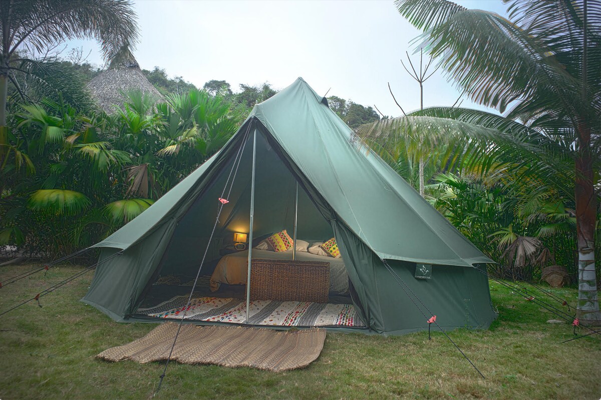 Carpa individual. Vive una experiencia sencilla y cercana a la naturaleza en nuestras dos carpas individuales, ubicadas bajo un frondoso árbol de mango. Cada carpa cuenta con un colchón semidoble de 110 cm de ancho y mosquitero. La carpa incluye: baño seco y ducha al aire libre, cocina compartida, una clase de yoga por la mañana, desayuno vegetariano o vegano, y wifi.