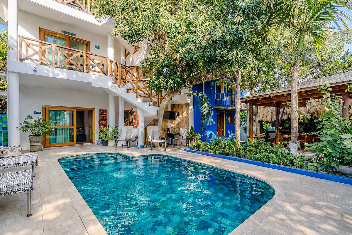 We just did a complete maintenance of the house!! Beautiful house with a beautiful garden full of large trees and wooden terraces. Built for the weather, it has two open-air dining rooms, one under the trees and the other very cool under a wooden pergola, three very cool bedrooms with large fans, full kitchen, 2 bathrooms, and a raised terrace with ocean views. A five minute walk from the beach and restaurants. The price includes a person cleaning and cooking. With Wi-Fi.