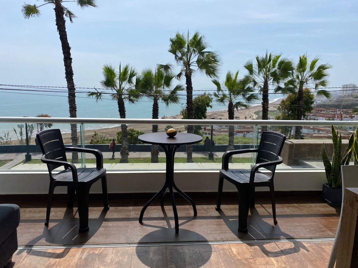 Moderno dúplex con espectacular vista al mar, a unos pasos del malecón y cerca a avenidas principales. Disfruta de una estadía inolvidable con las siguientes comodidades: 1) Cocina equipada (cafetera, licuadora, tostadora, refrigerador, etc). 2) Sala + sofá cama + SmartTV (Netflix, HBO, Youtube Prime incluido) 3) Comedor para 4 personas 4) Cuarto en segundo nivel con cama queen y TV Smart 5) Baño y balcón con vista al mar en ambos pisos 6) Estacionamiento 7) Áreas comunes: Piscina y Gym