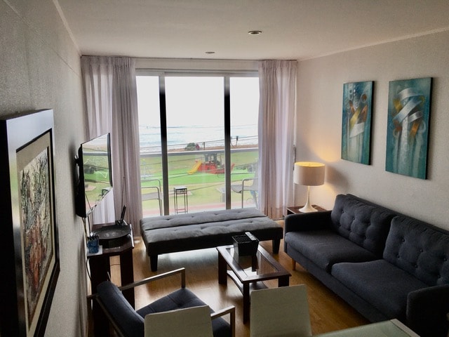 Esta minuciosamente pensada para hacer tu estadia inolvidable comoda y placentera. Escapate de la rutina DIsfruta del mar,aire libre y actividades Sala equipada con tv , WI-FI y repetidor Comedor completo Cocina equipada. El dormitorio principal con cama de 2 plazas,2 veladores; tiene baño privado y closet amplio Segundo dormitorio cama con closet y baño Areas de recreacion : Piscina niños Piscina adultos Gimnasio con sauna Juegos de niños Juegos de mesa Area de parrilla, Area de lavanderia