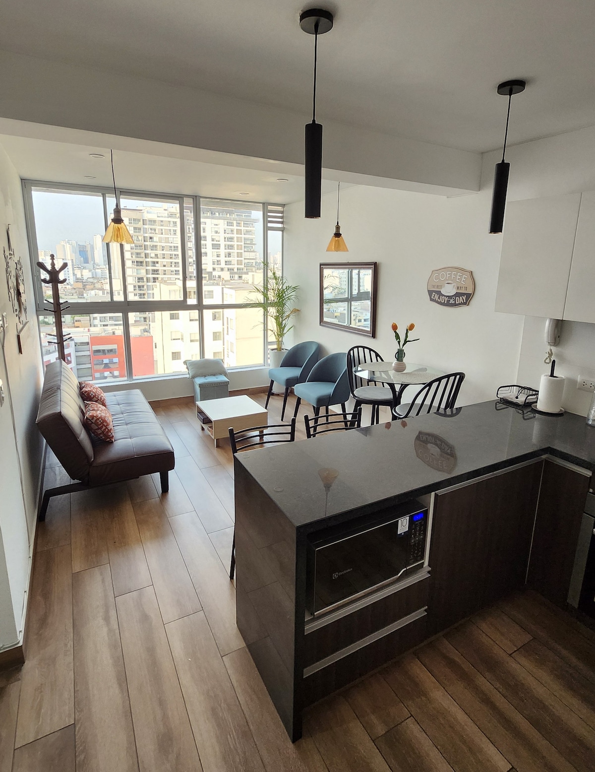 Departamento de estreno ubicado en excelente zona en Lima, Peru. Tendrás cerca restaurantes, centro comerciales, farmacias, supermercados, casinos, gimnasios, y oficinas corporativas y comerciales a menos de tres cuadras de distancia o cinco minutos a pie. Disfrutarás de un departamento totalmente nuevo y recién amoblado que hará tu visita en Lima placentera. El apartamento está diseñado con la finalidad de brindar al huésped un ambiente cálido y relajado, y disfrutar de una gran vista.