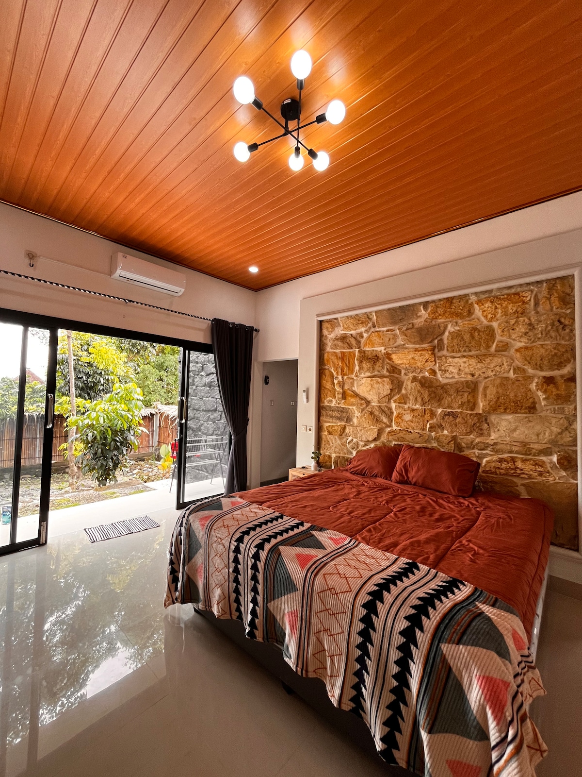 Villa unik batu dengan interior bohemian style. Di design untuk Barefoot Living dengan nyaman. - kamar tidur utama : bed king size - ruang tamu minimalis+ sofabed - Kitchen dengan peralatannya, rice cooker , kulkas, alat makan & minum, dan koleksi teh - kamar mandi dengan taman kecil semi outdoor dengan air terjun buatan untuk mandi. (Toilet duduk, ada sabun dan shampoo) - Teras menghadap kebun belakang - Bean Bag - Halaman depan luas dengan pintu gerbang, aman untuk parkir kendaraan