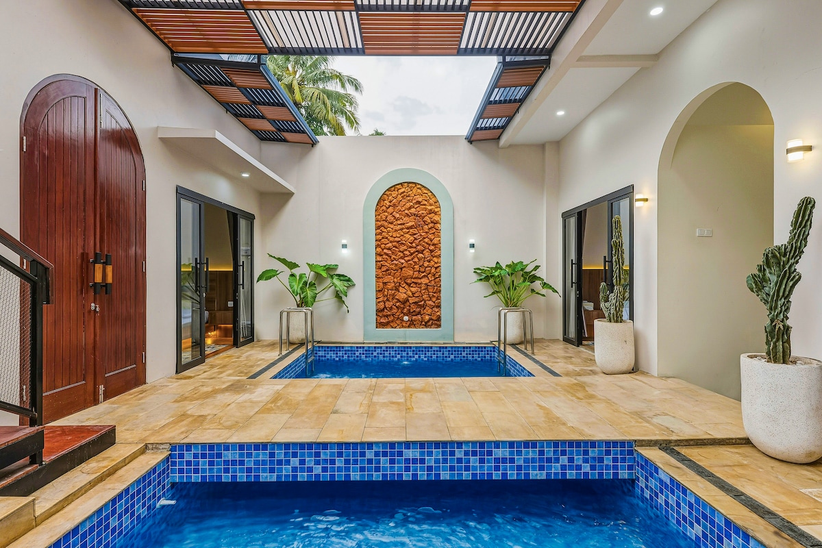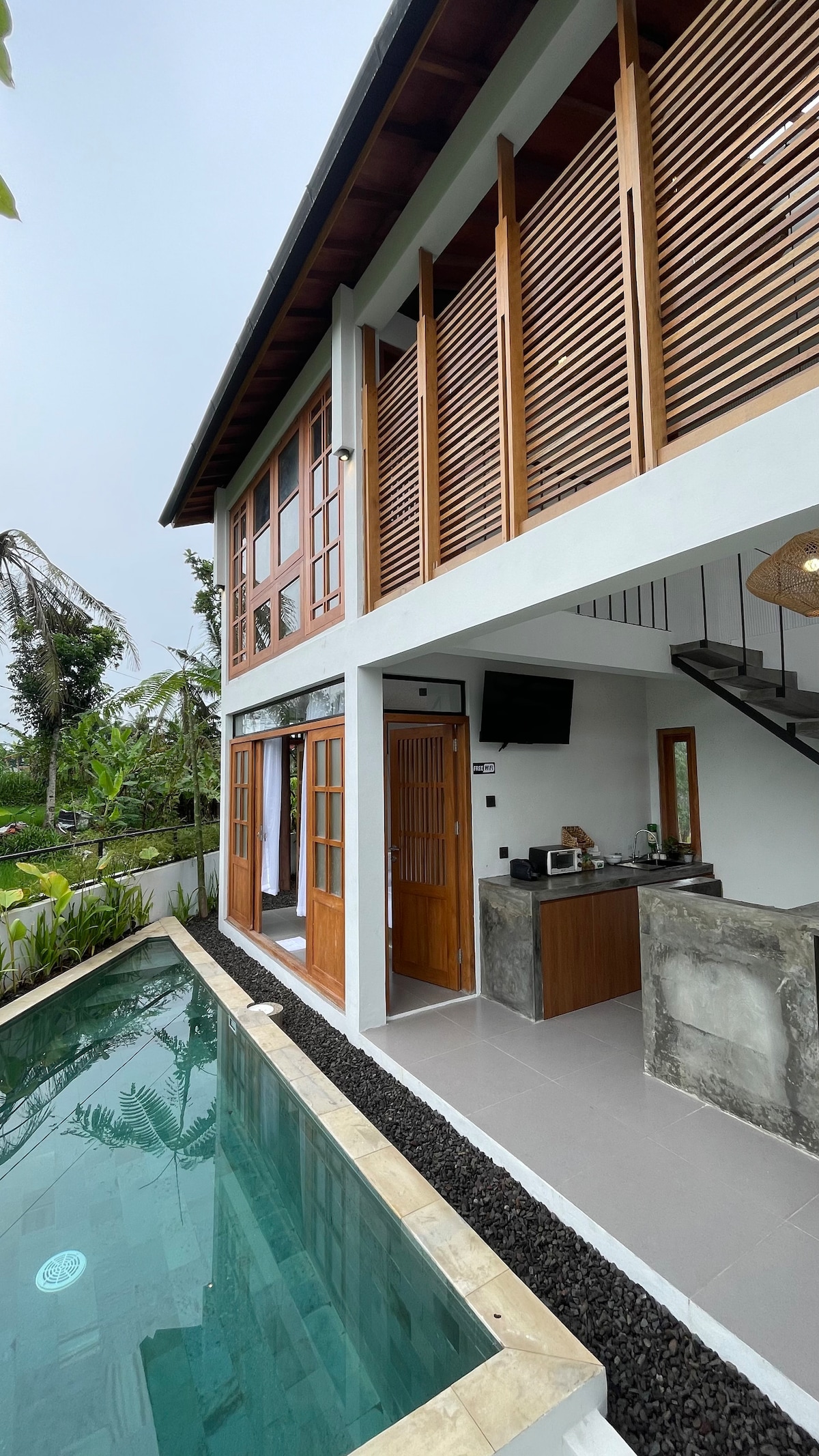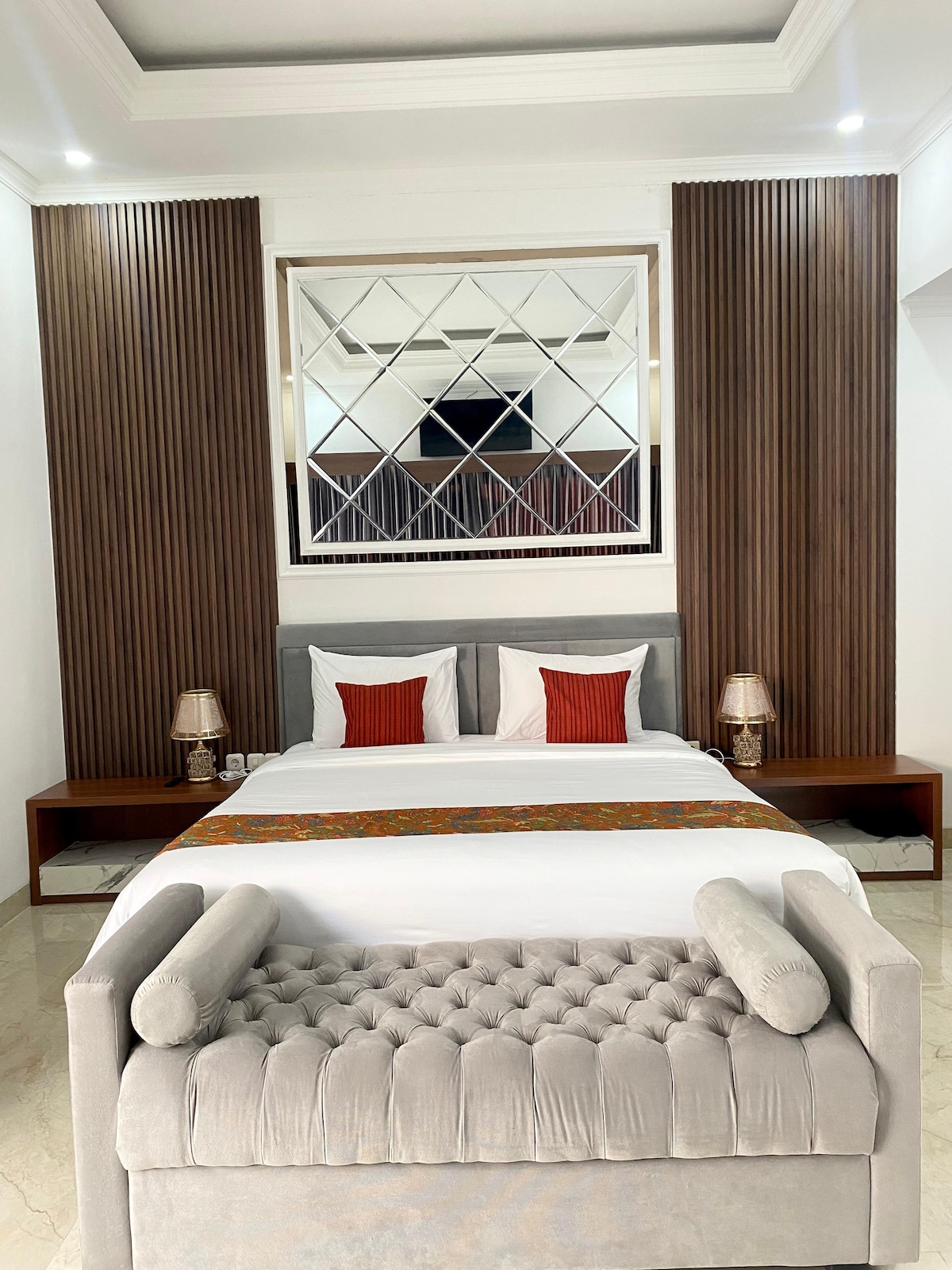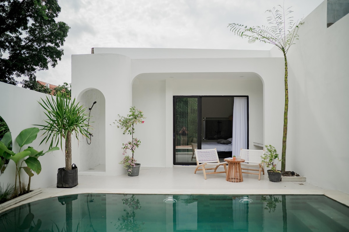 A villa with a private pool, and mezzanine design, featuring a sleeping area upstairs and a spacious living room with mini pantry downstairs. Accomodates up to 4 guest, with an extra bed option available. A connecting door is available to the next door villa of the same type. Located in a quiet yet strategic area, close to Yogyakarta’s popular attractions and culinary spots.