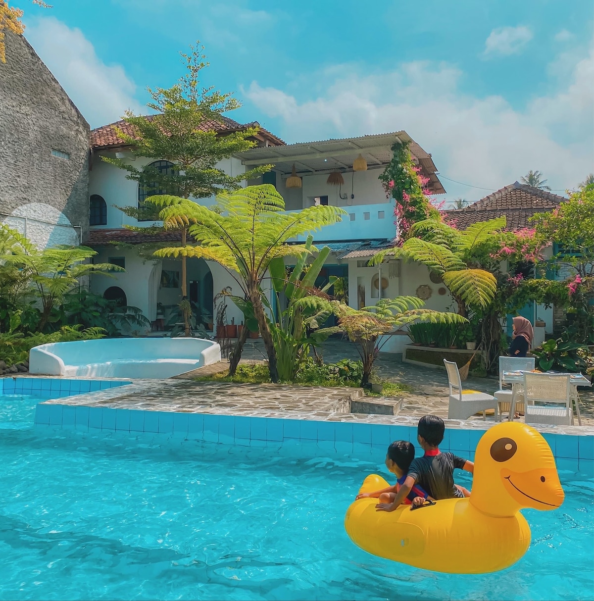 Best deal in Yogyakarta! A spacious private villa on Jalan Kaliurang km 13, just north of the city. A cozy 1BR private pool villa surrounded by lush trees and soothing river sounds. Located in an area filled with great local eateries. Perfect for a relaxing stay. Fits up to 5 guests with additional charge for extra beds. Features a private pool, mini pantry with basic cooking and dining tools, TV with Netflix, bathtub, king-size bed, and a sofa.