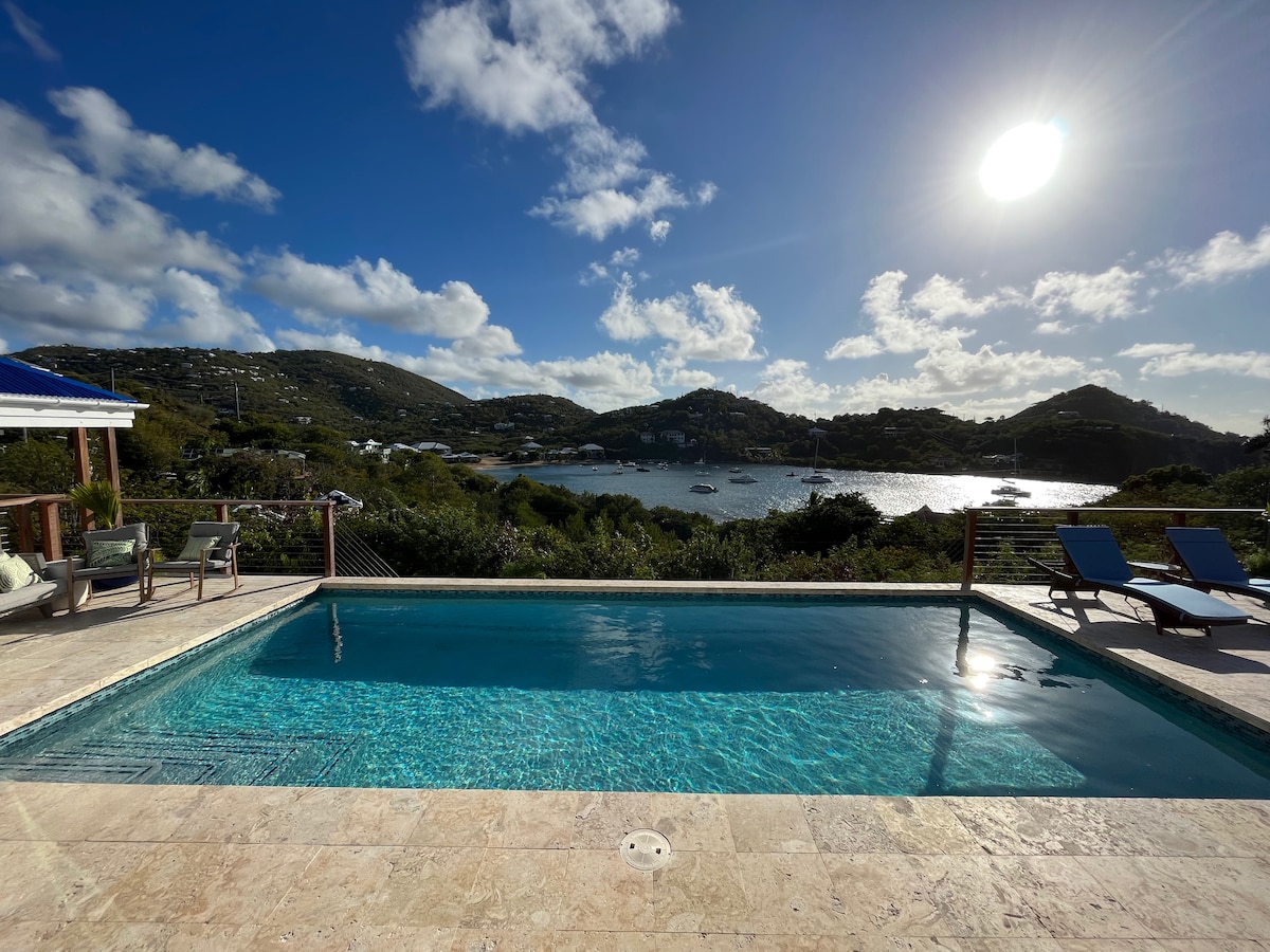Blue View is brand new construction! A classic soft modern Caribbean architecture set on a full acre with sweeping views from sunrise over Ram Head peninsula to sunset over St. Thomas. It is a very special property sited with the utmost care to capture Leeward breezes with an unobstructed view to St. Croix 40mi away. Find the perfect amount of sun or shade you desire at any time during the day. Blue View is a separate villa located adjacent to our main Villa and 6 minutes to Cruz Bay