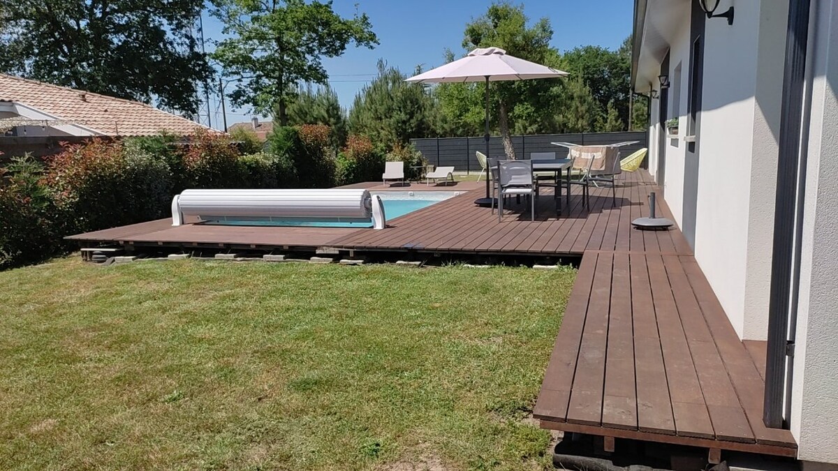 Maison neuve entourée de forêt à côté de la piste cyclable et plages de la côte landaise Elle se compose d’un salon avec cuisine américaine, de 3 chambres dont 1 suite parentale avec sdb et wc , pour finir une autre sdb et wc indépendant . Fibre internet 🛜 Pour l’extérieur une piscine pleins sud de 4 sur 8.5 m chauffée de avril au 11 novembre avec jardin paysager et 110m2 de terrasse en bois . Plage et golf de Moliets et maa à 10mn Vieux boucau 15mn Hossegor 28mn . Biarritz 50mn