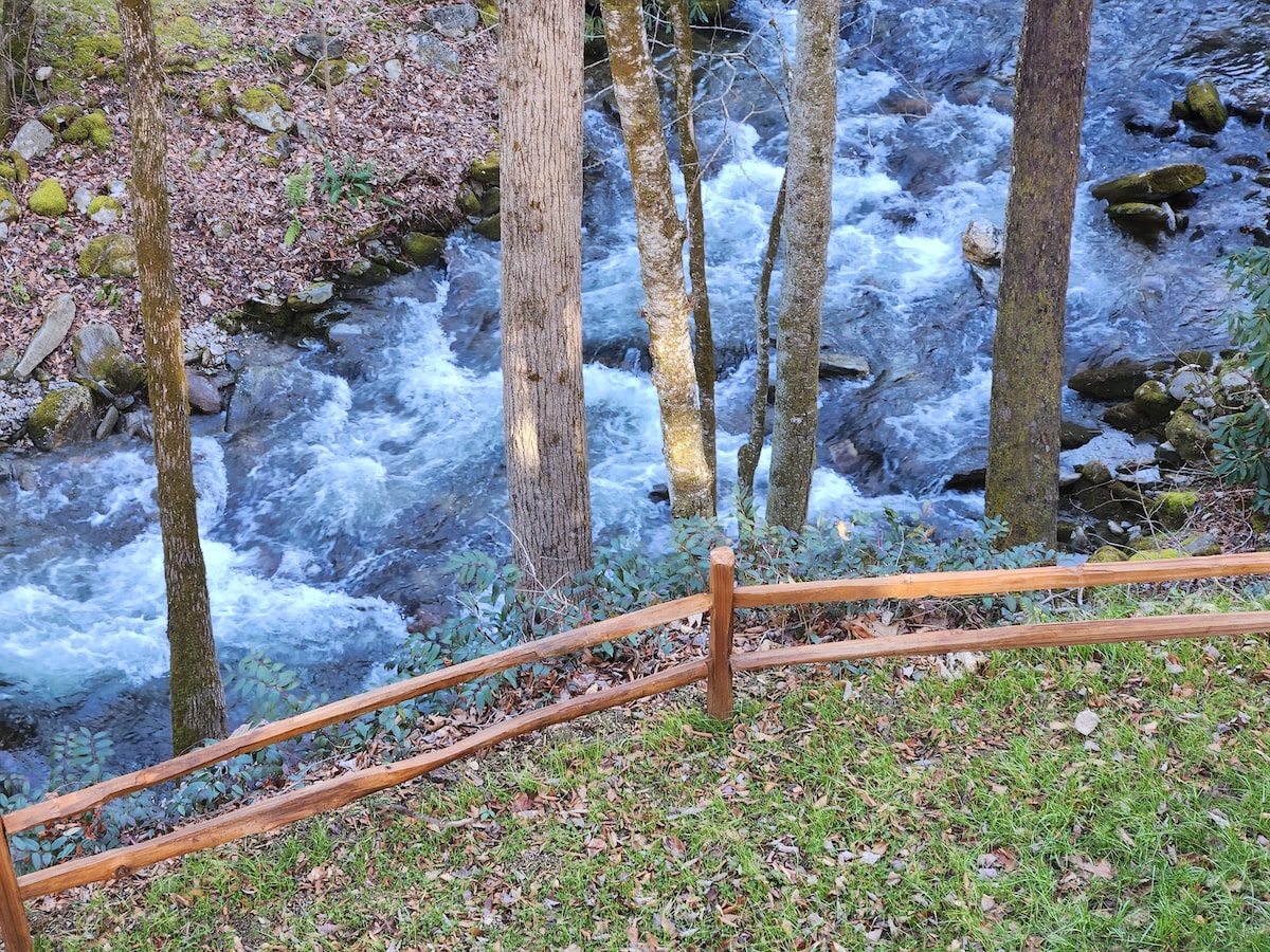 Welcome to rustic luxury at its best in Maggie Valley, NC! This 2170 sq. ft., 3 bedroom/ 3.5 bath cabin built in 2022 with 200 year old reclaimed wood beams, offers a serene mountain escape to enjoy the sounds of the 20 ft wide rushing creek from every room! Enjoy privacy, open air dining, amazing deck views, the outdoor hot tub, and stroll to the creek fire pit with seating for 8 to roast S'mores. This house has frequent visits from elk and turkeys as they travel to the creek. Sorry, no pets.