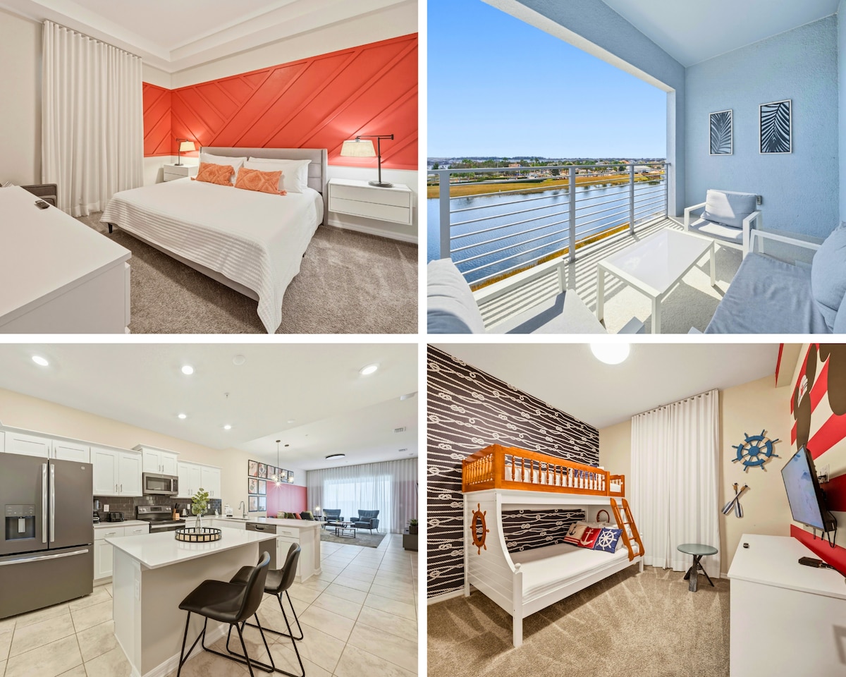 Just minutes from DISNEY, Stylish BRAND NEW fully renovated 3bed/2bath fully equipped apartment for up to 8 guests, located in the family friendly Secret Lake Resort. Master suite has a KING bed & 55" TV. Second bedroom has 2 QUEEN beds & 65" TV. Third Bedroom has 2 FULL beds & 65" TV. The open floor plan blends Kitchen, Dining & Living room w/ a 65" TV. Close to Disney Parks, Margarita Ville Water Park, Outlet malls & Retail stores. Amenities: Wi-Fi, Pool, BBQ & Gym. NO RESORT FEES