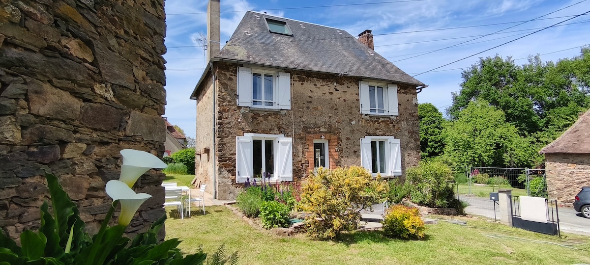 Maison en pierres rénovée avec un agréable jardin, située à Glanges dans un hameau en impasse à 2 km de l'A20.Jardin arboré, terrasse, salon de jardin et barbecue pour se détendre. Deux chambres : 2 lits queen size (160x200) et 1 lit 140 x190, cuisine entièrement équipée, espace jeux, bureau. Stationnement facile devant la maison. Logement non-fumeur, animaux non admis. Ménage par vos soins (forfait ménage 70 € sur demande). Nombreux lacs et plans d'eau à proximité. Tous commerces à 5 minutes.