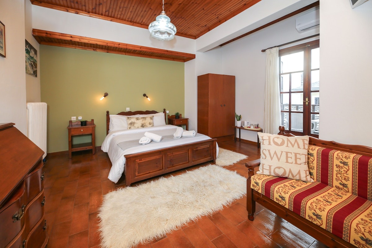 The family connecting room has two spaces and is distinguished for its carefully arranged layout, the pleasant soft colors, the elegant furnishings and the view of the famous square of Portaria with the centuries-old plane trees Consists of the main bedroom with a double bed and a small living room with a sofa that can be converted into two single beds. It is ideal for family accommodation. It is equipped with double glazing for thermal insulation, color satellite LCD TV and DVD, telephone, hairdryer, wireless internet access, fridge, water boiler, bathroom with shower and cabin, central heating and air conditioning.