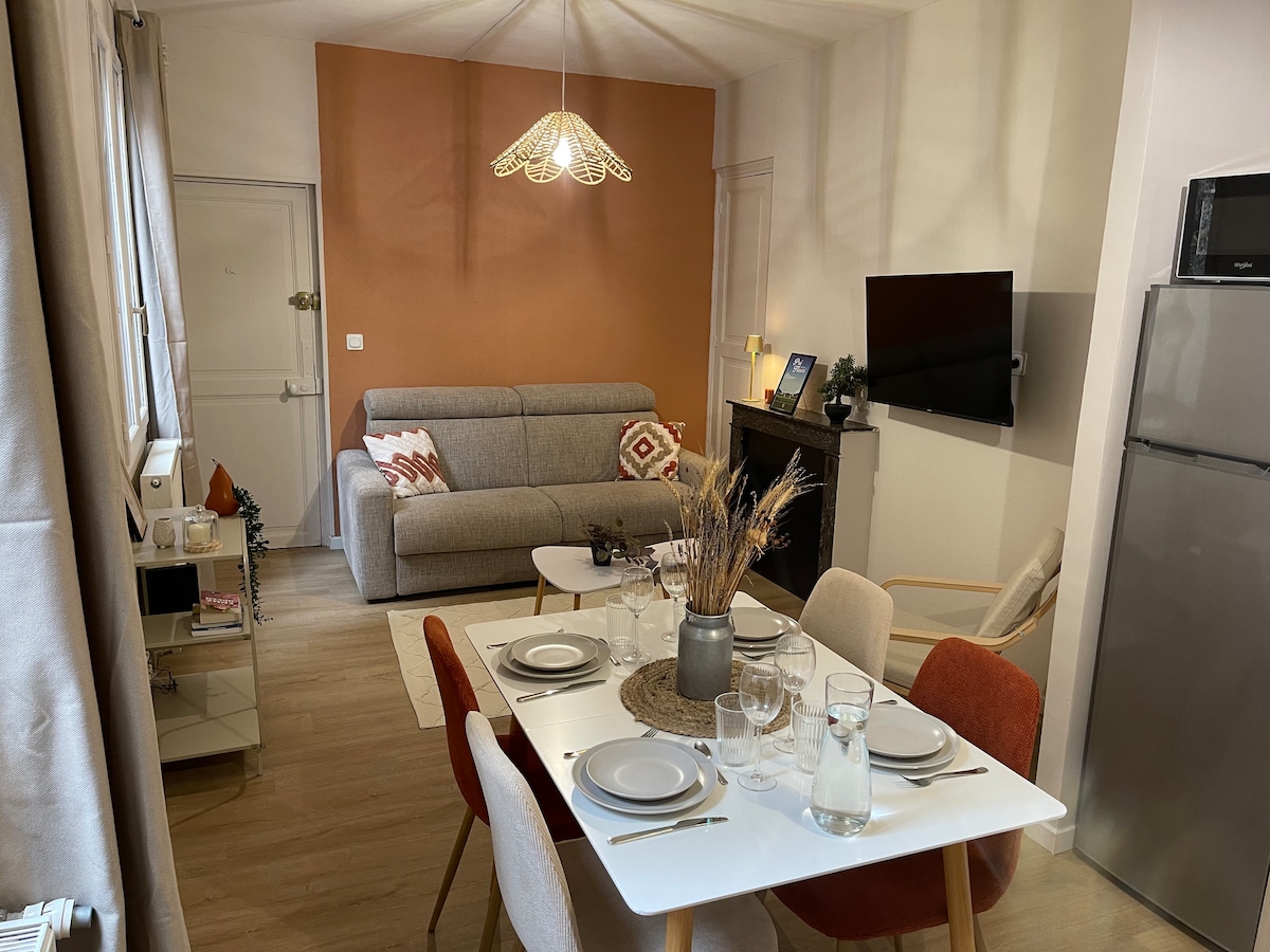 Joli Duplex de 27 m2 entièrement rénové mêlant moderne et ancien. Il bénéficie d'une pièce avec salon, salle à manger et cuisine équipée, d'une salle de bain avec douche, d'une chambre à l'étage et d'une terrasse (vous risquez d'y croiser Suzie notre adorable chien). Vous y trouverez du parquet ancien et un carrelage d'époque. L'appartement est attenant à notre maison. Situé en centre ville dans le quartier Colbert, à 2 minutes à pied de l'hyper centre. Parking gratuit à 1 minute à pied.
